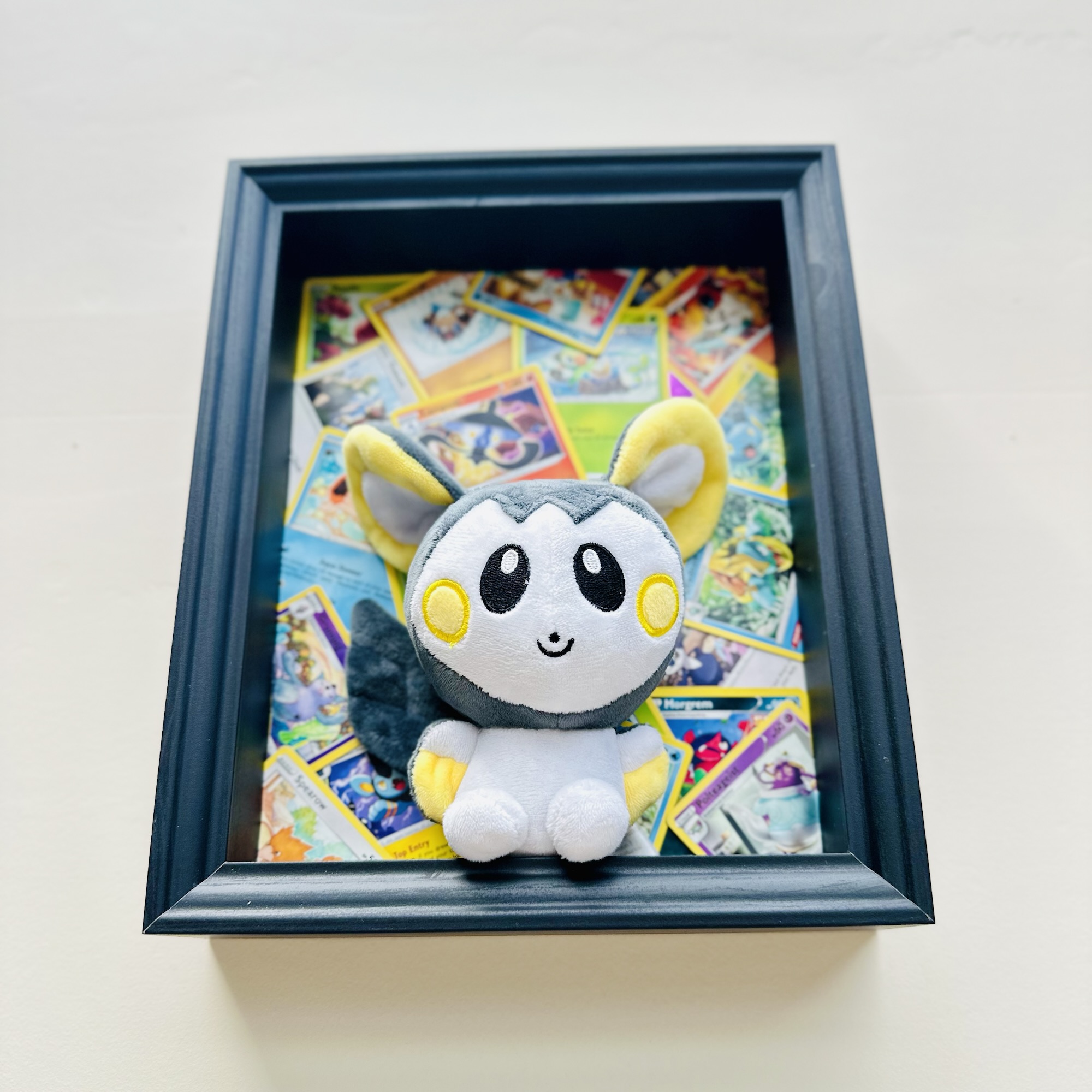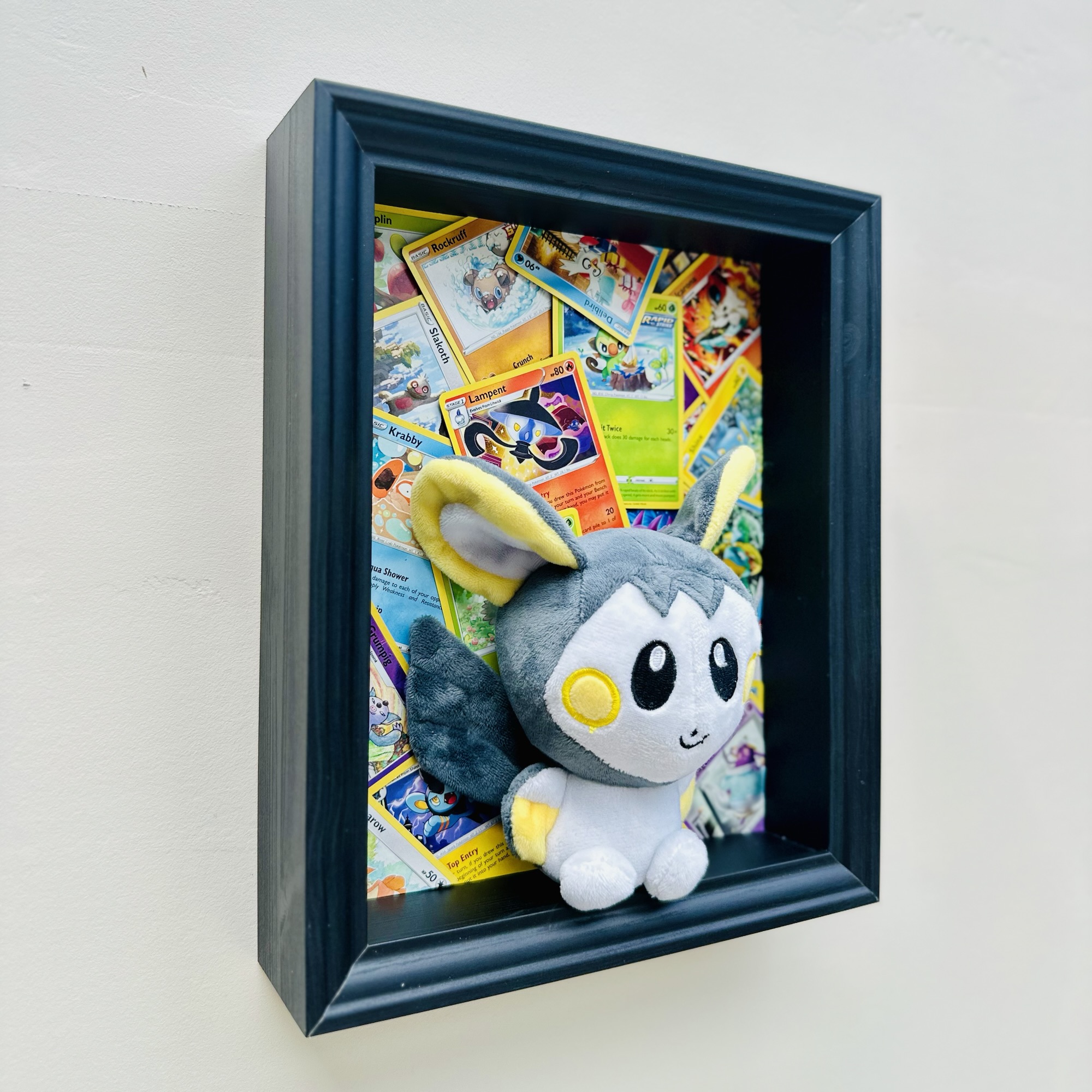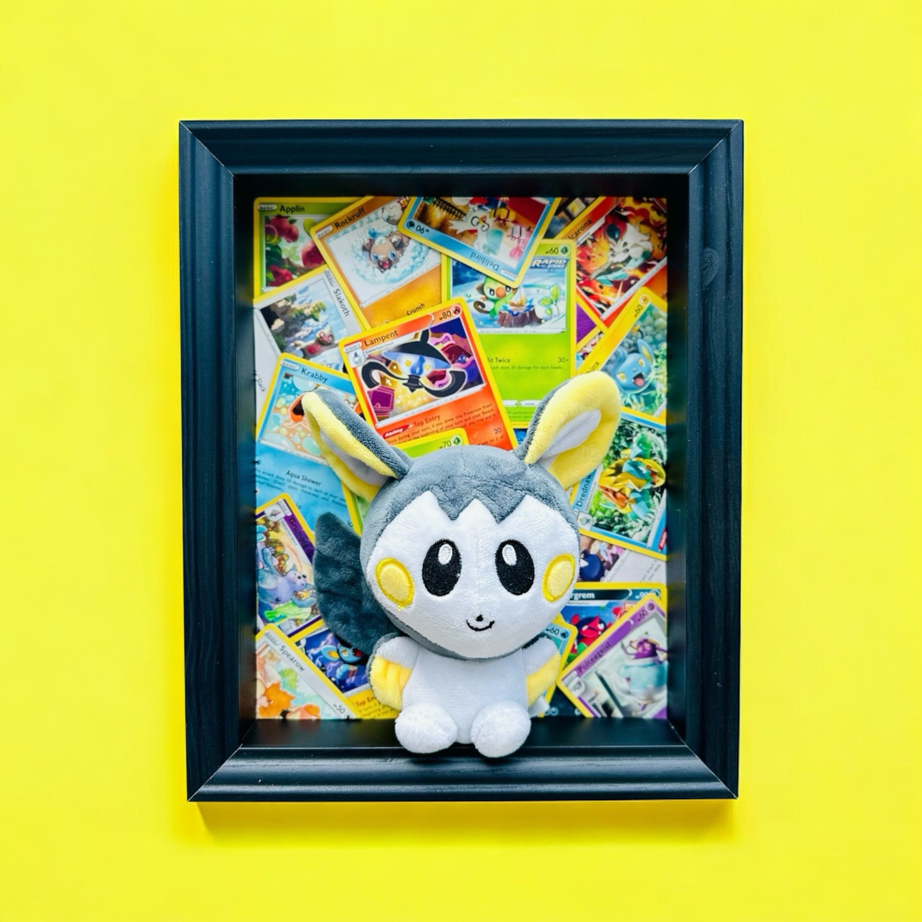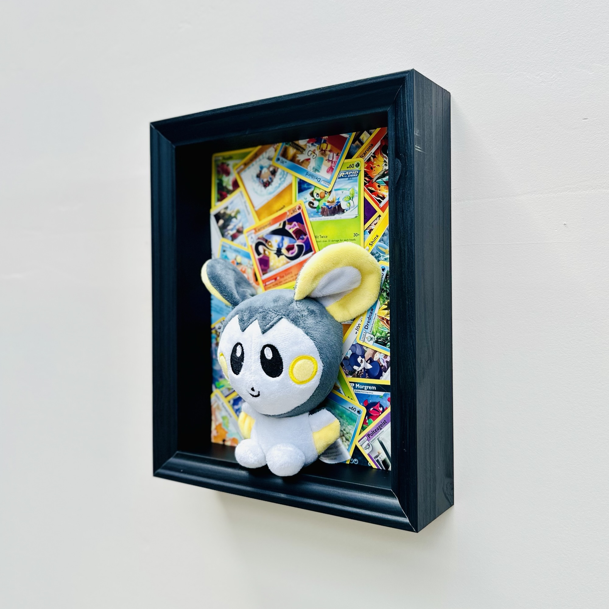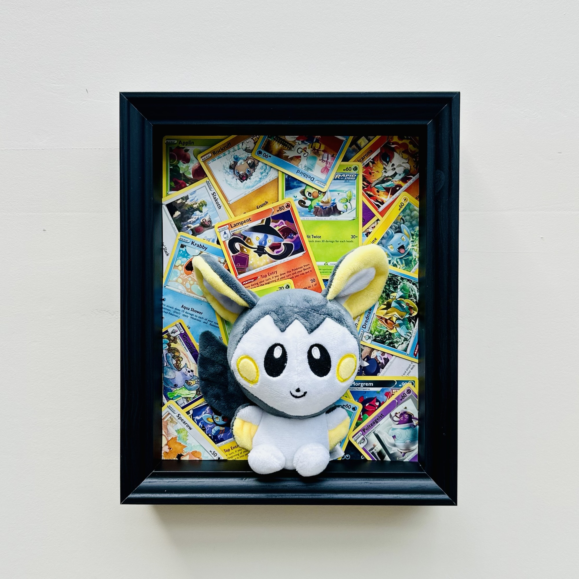 framed abstract collection of glued second-hand Emolga (by Tomy) with original Pokémon cards.