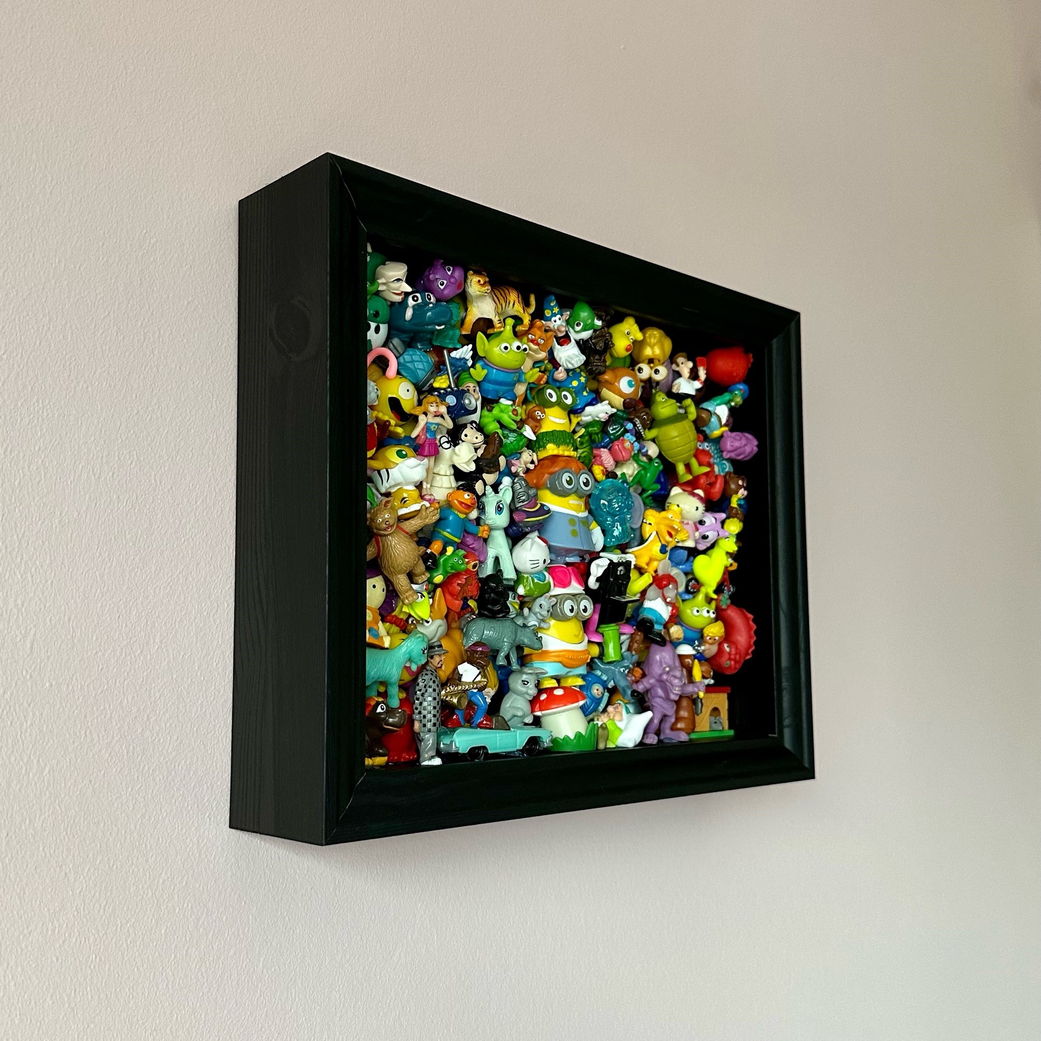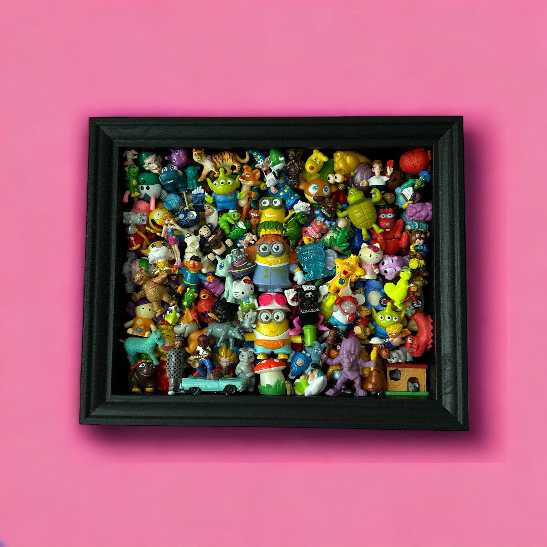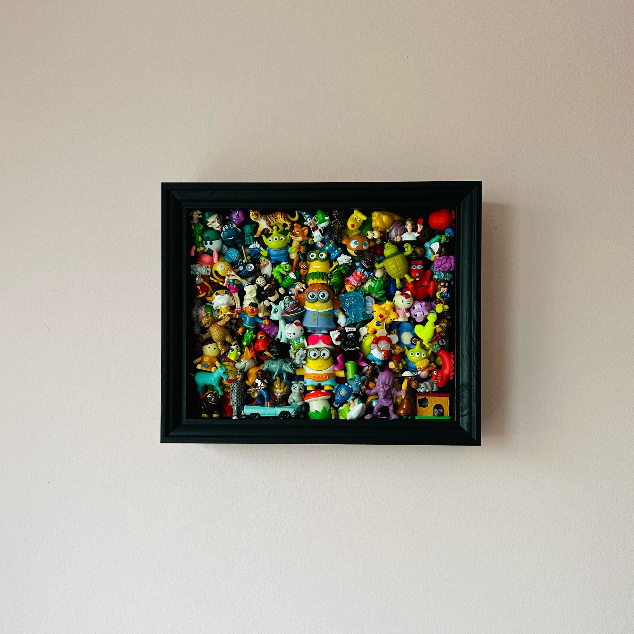 framed abstract collection of glued second-hand toys. frame can be used with or without plexiglass.