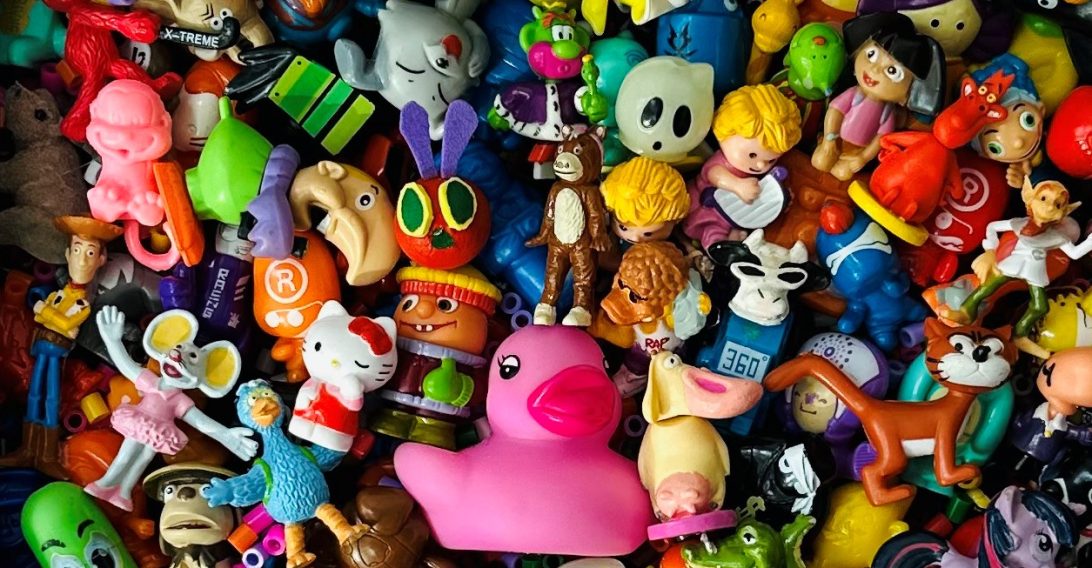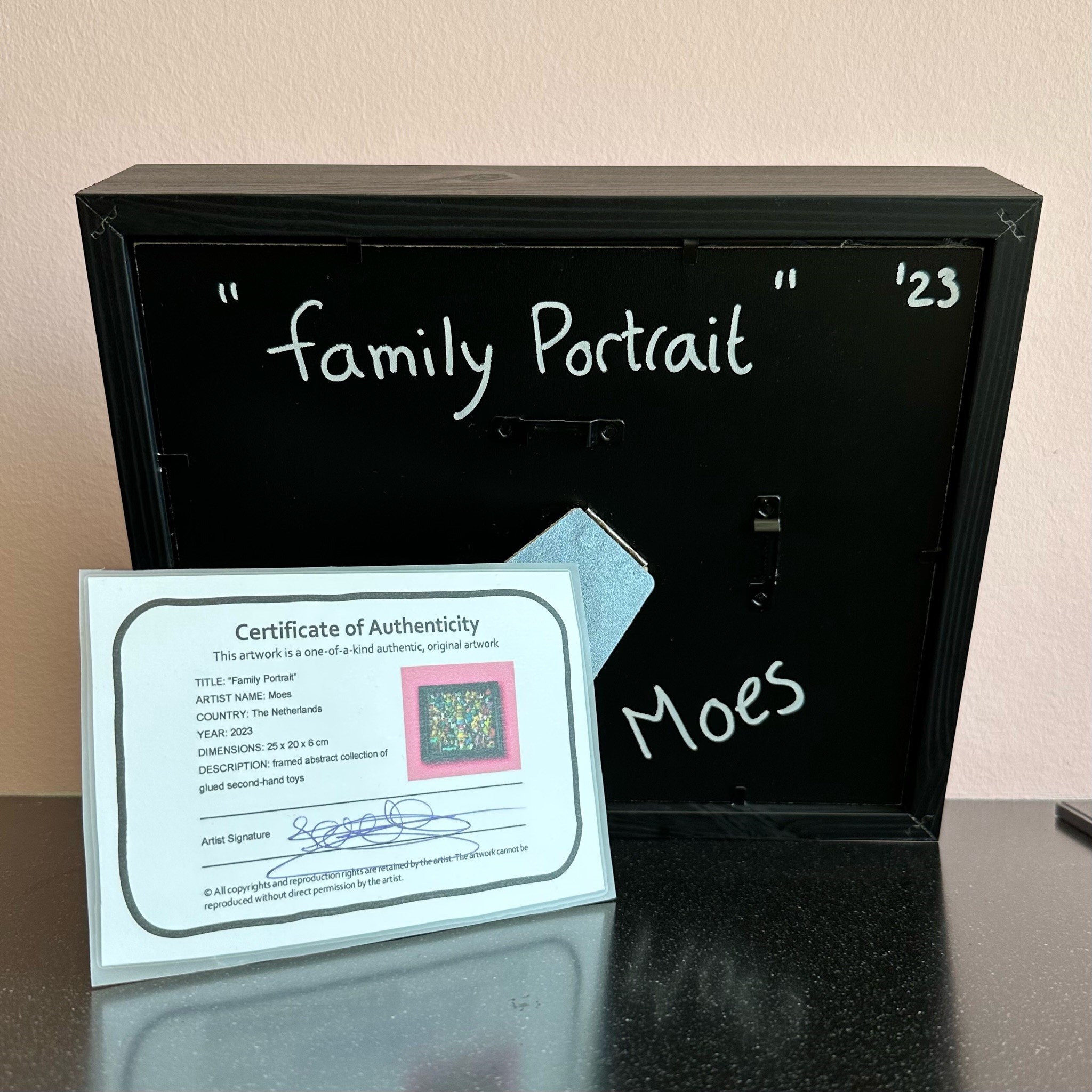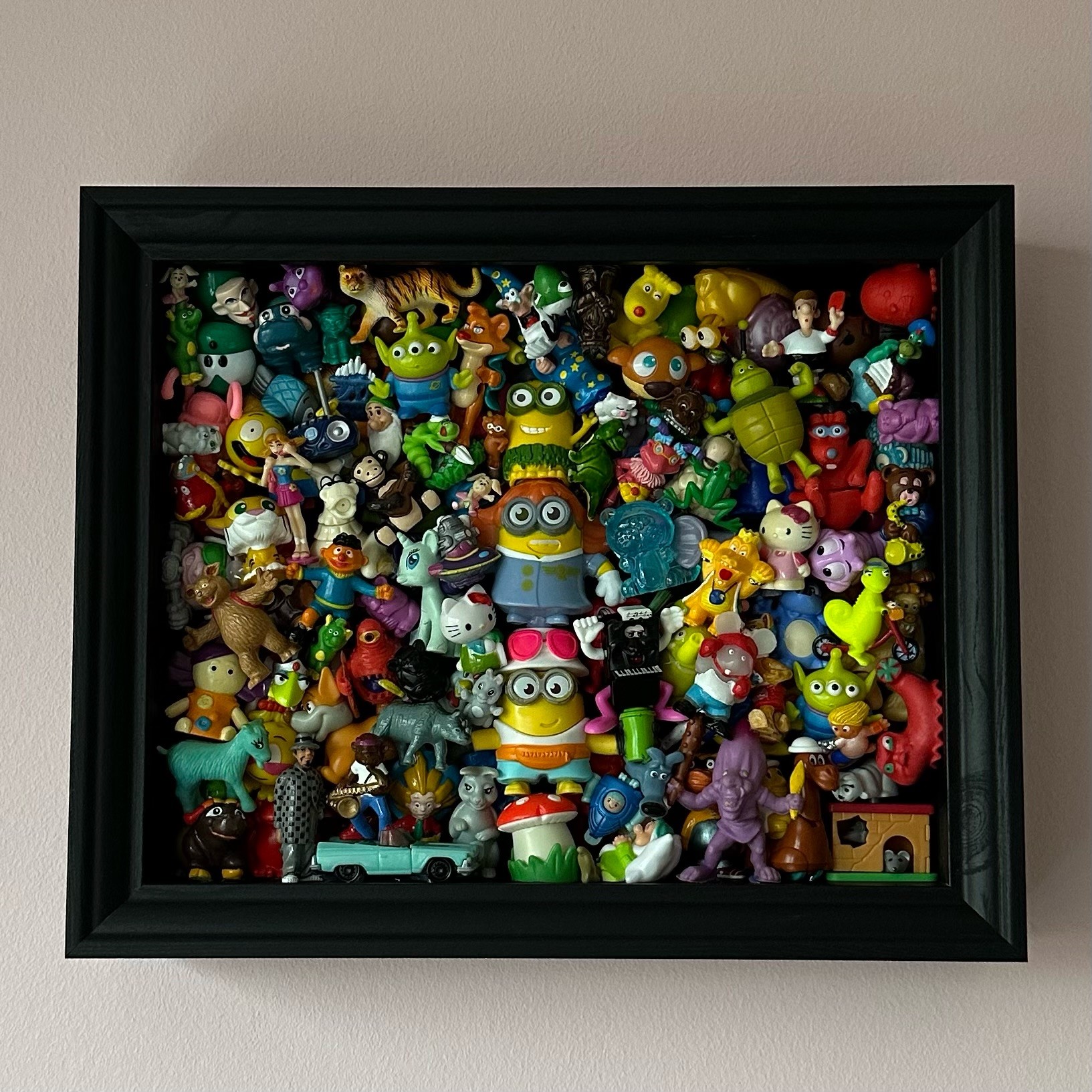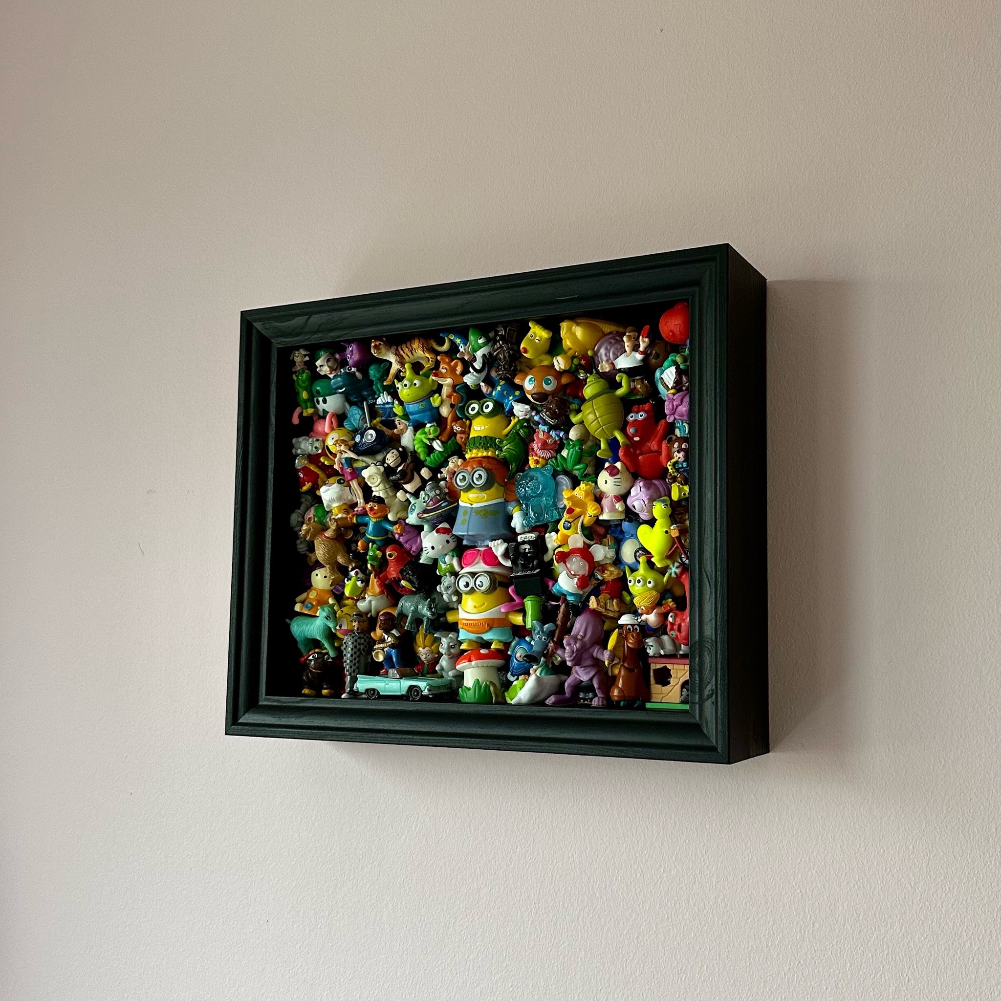framed abstract collection of glued second-hand toys. frame can be used with or without plexiglass.