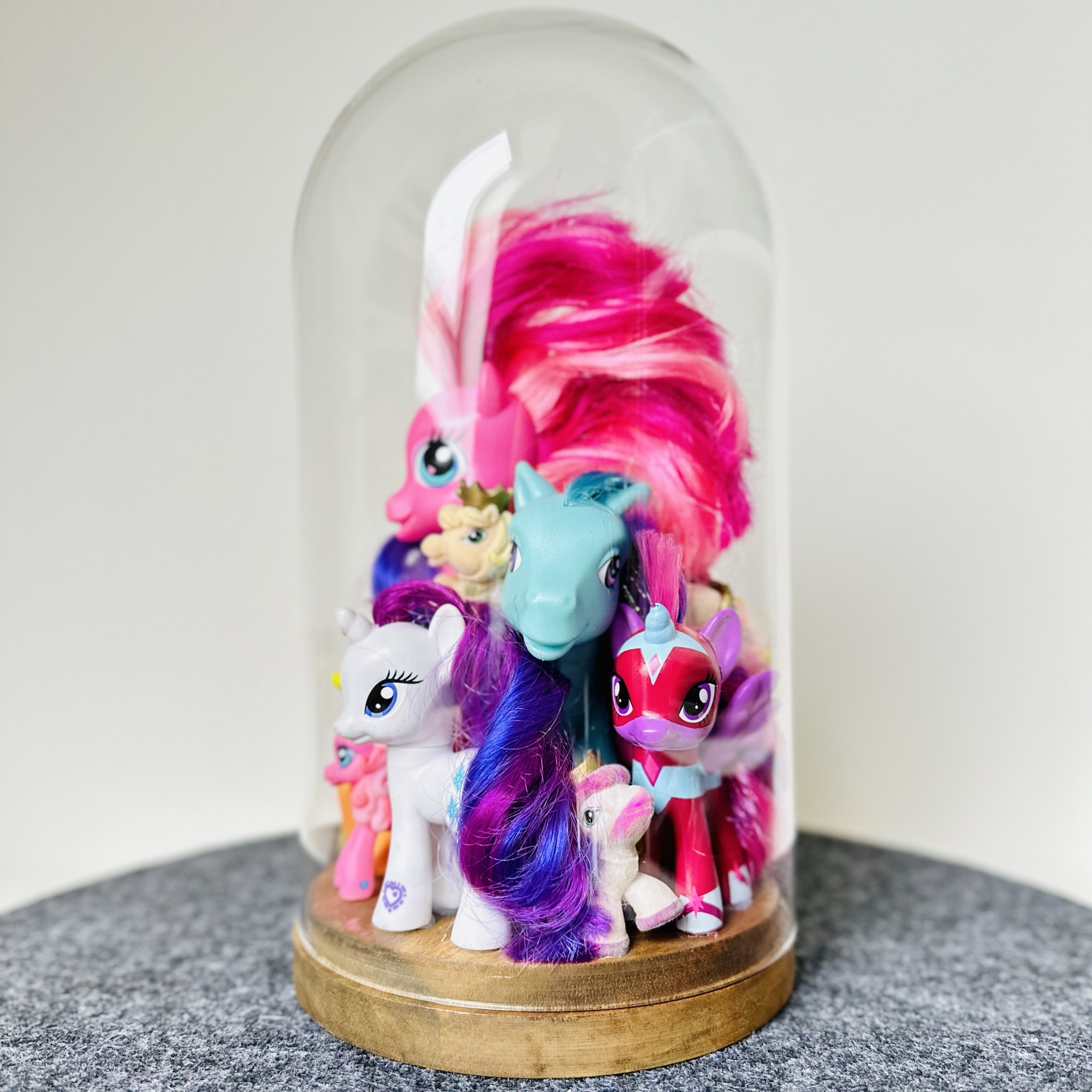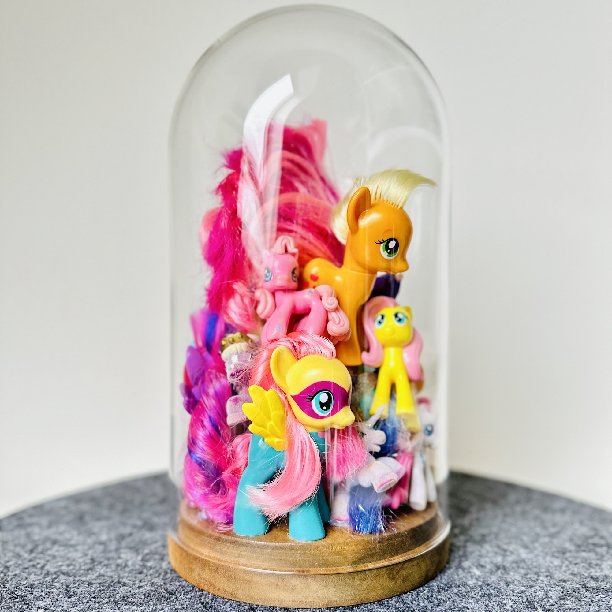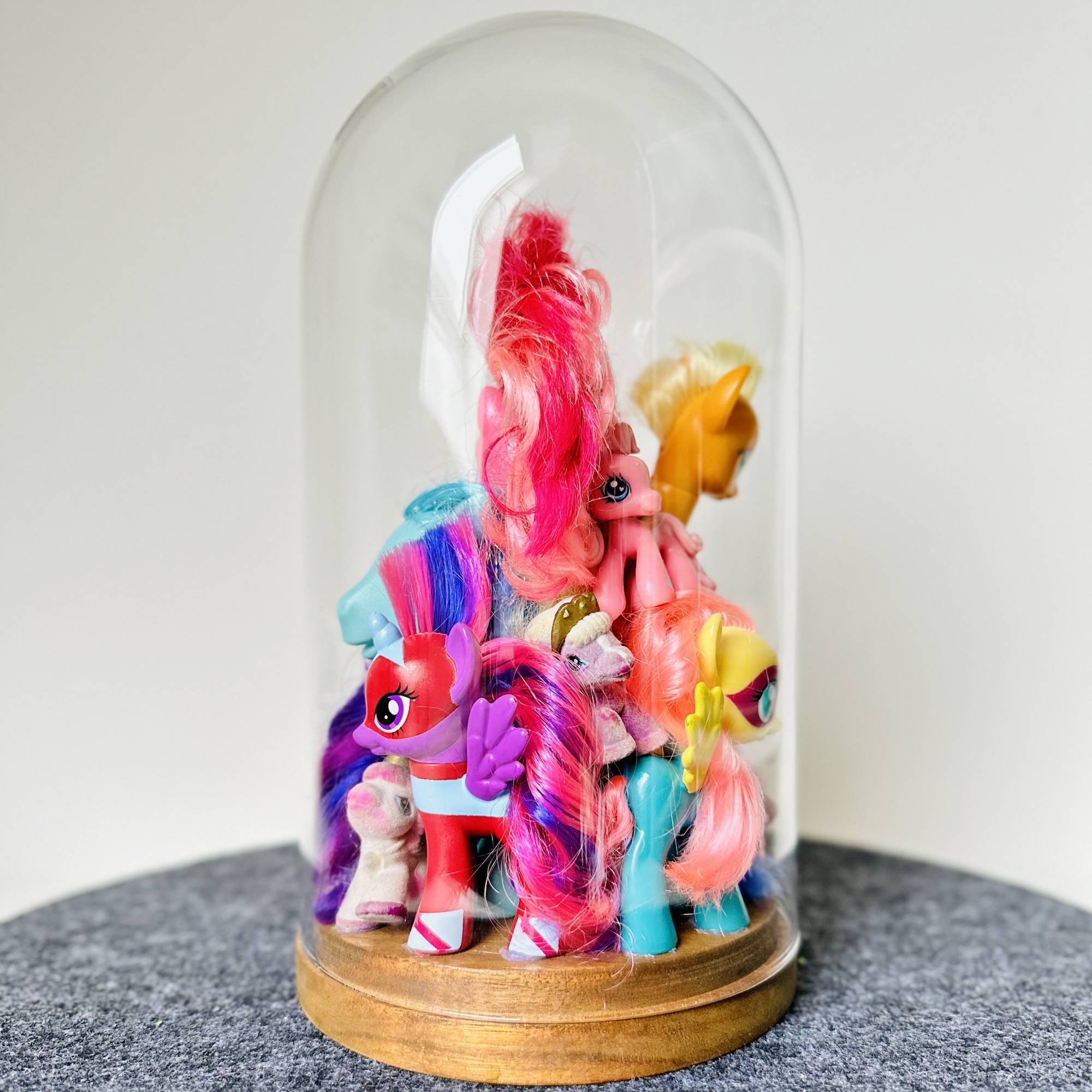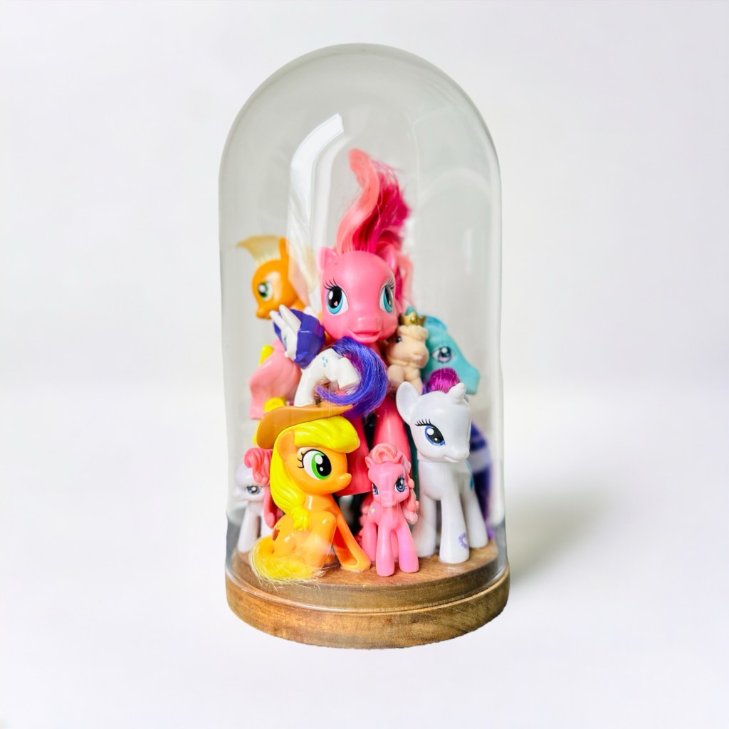 abstract collection of glued second-hand toys in a glass dome.