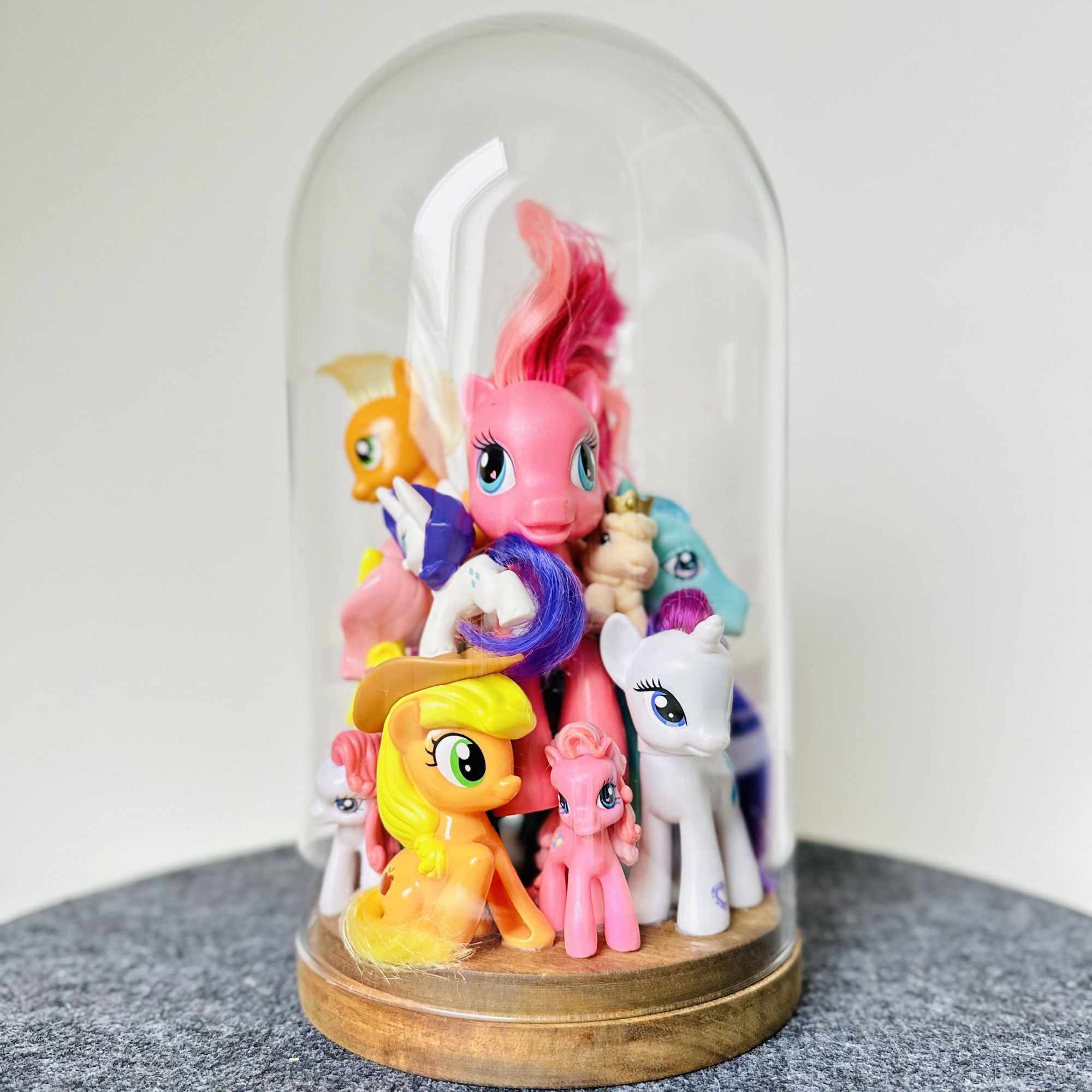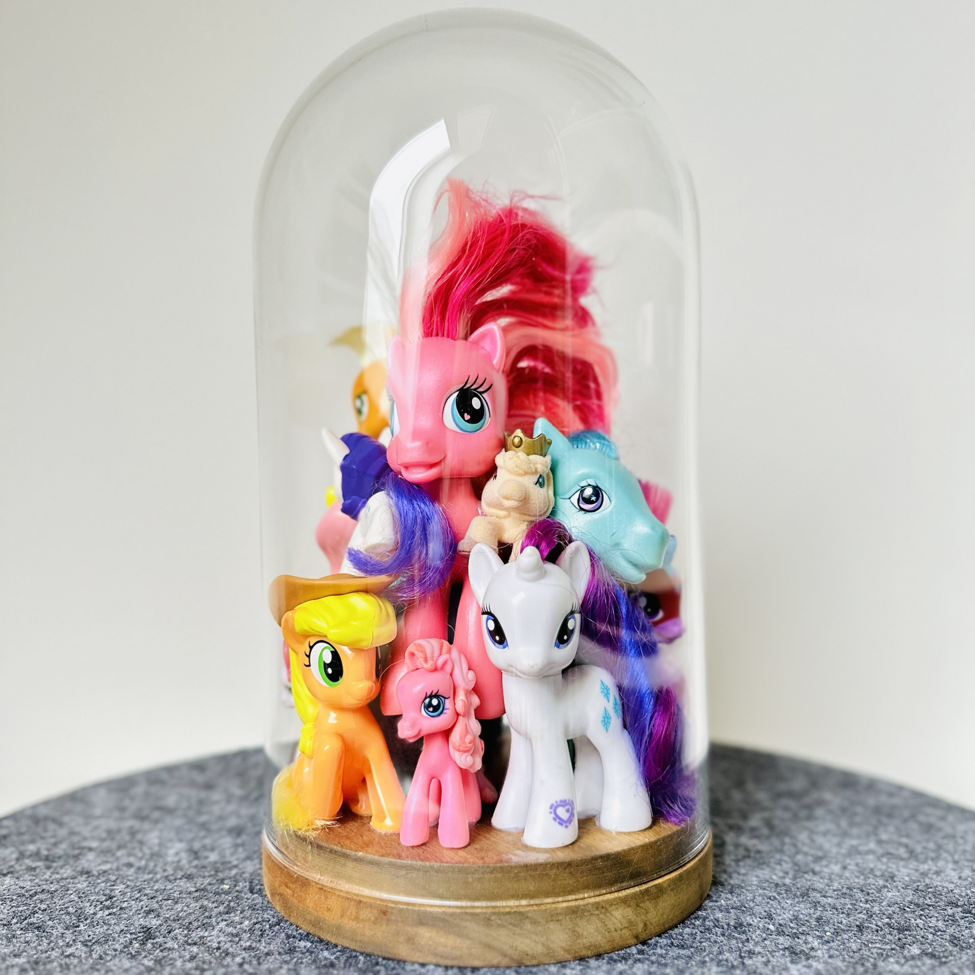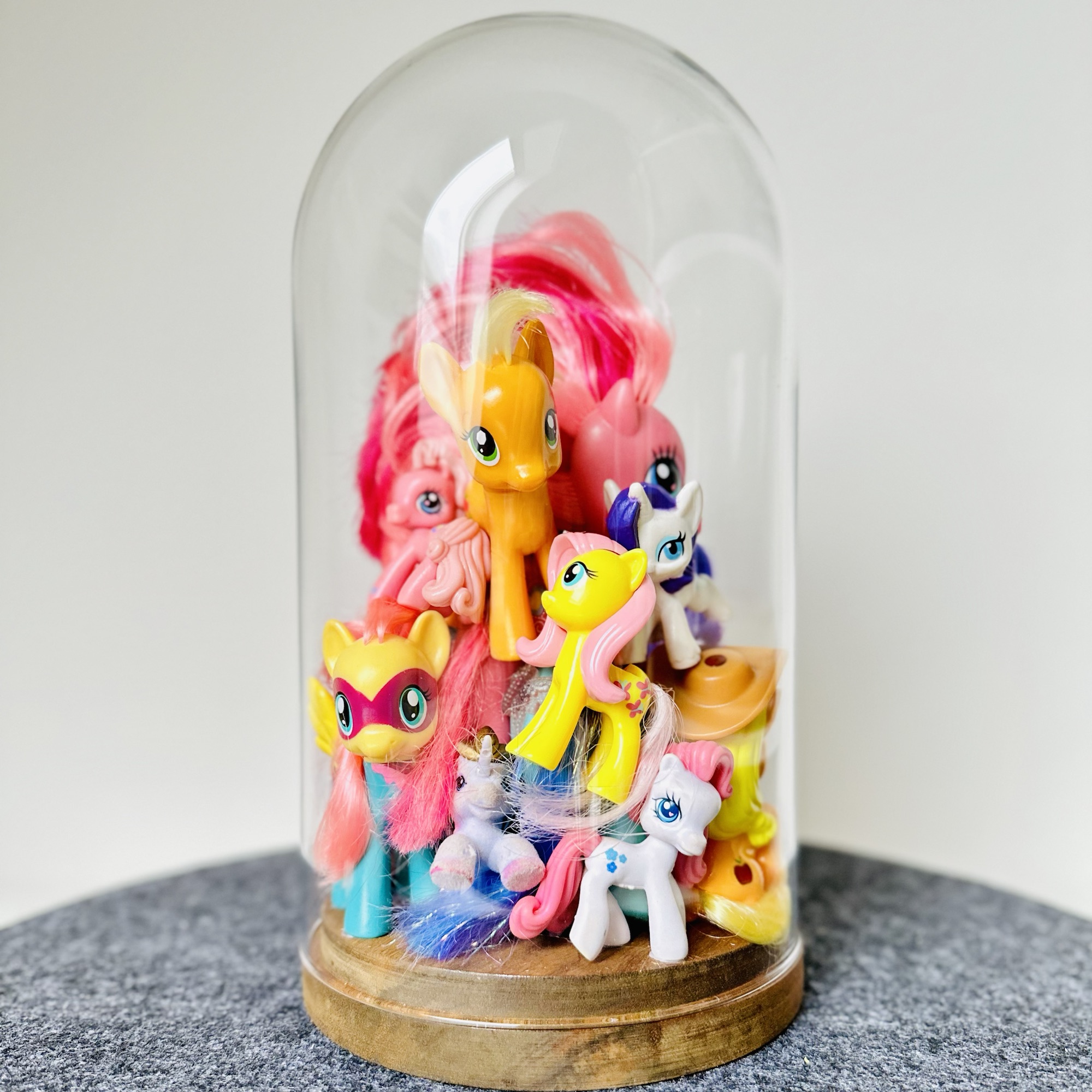 abstract collection of glued second-hand toys in a glass dome.
