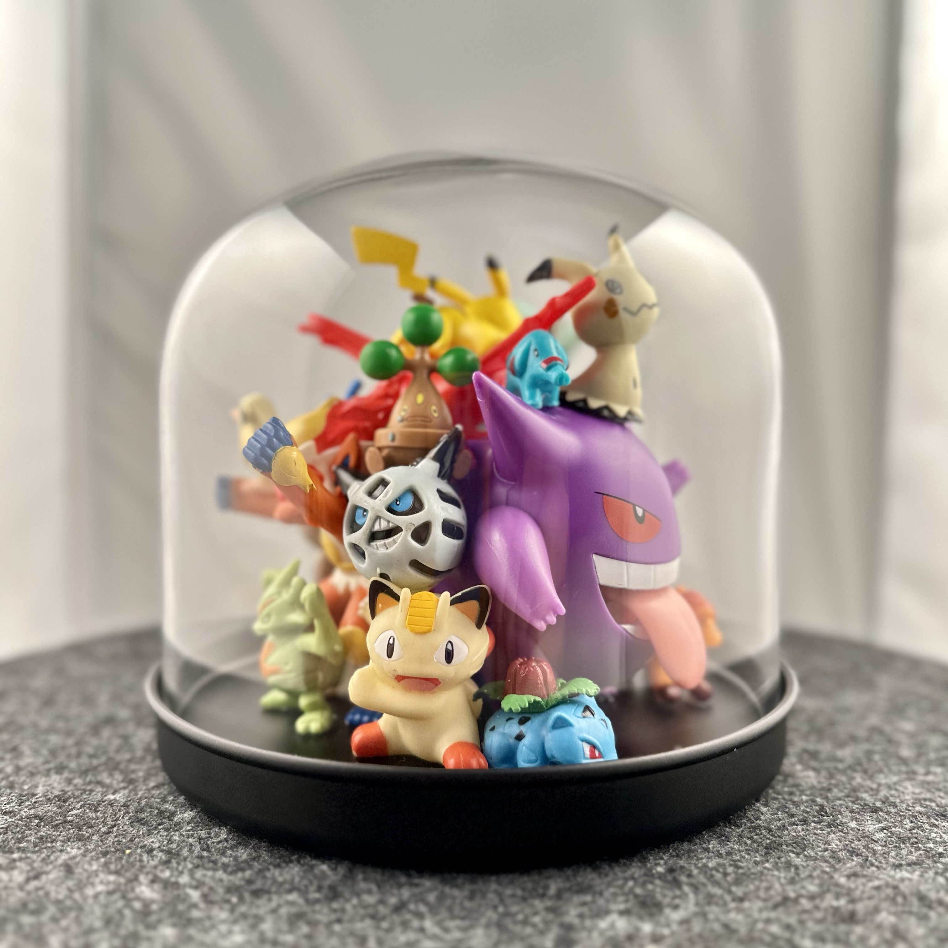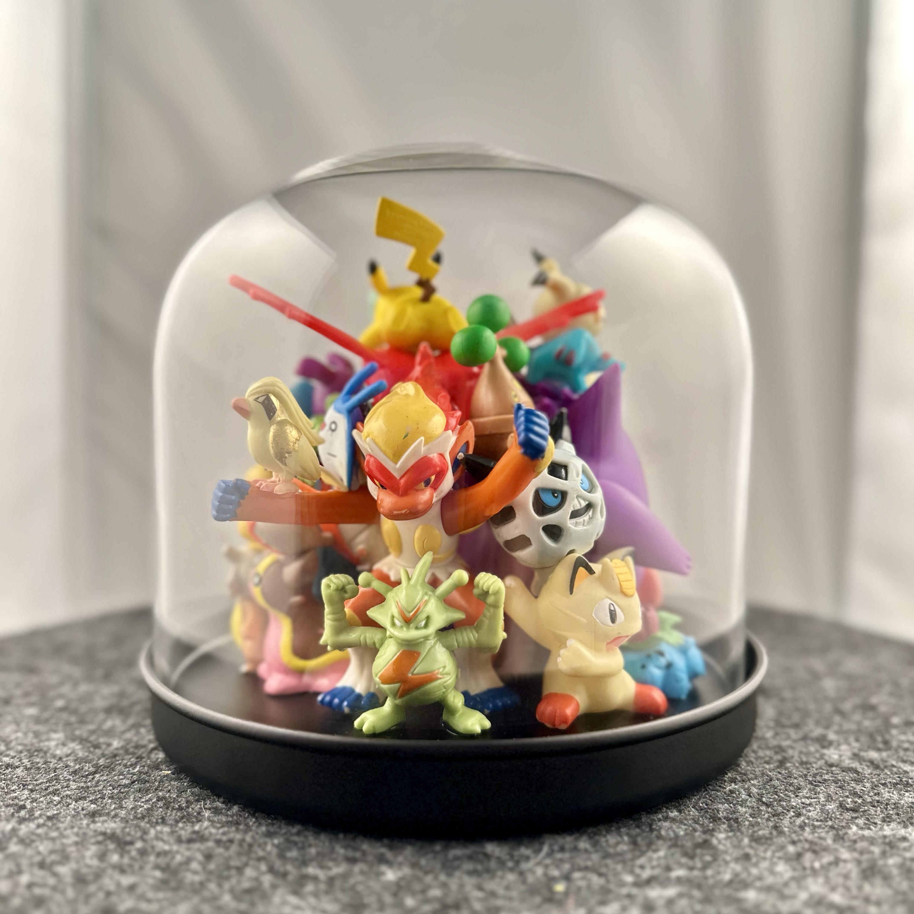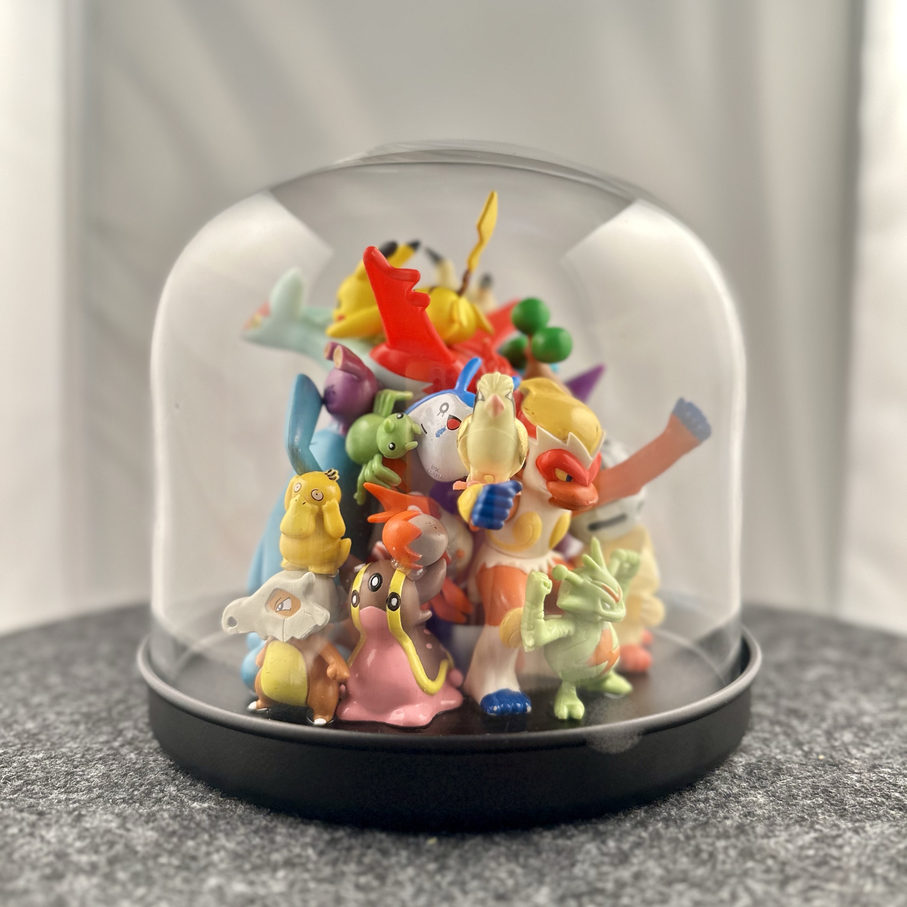 abstract collection of glued second-hand toys in a glass dome.