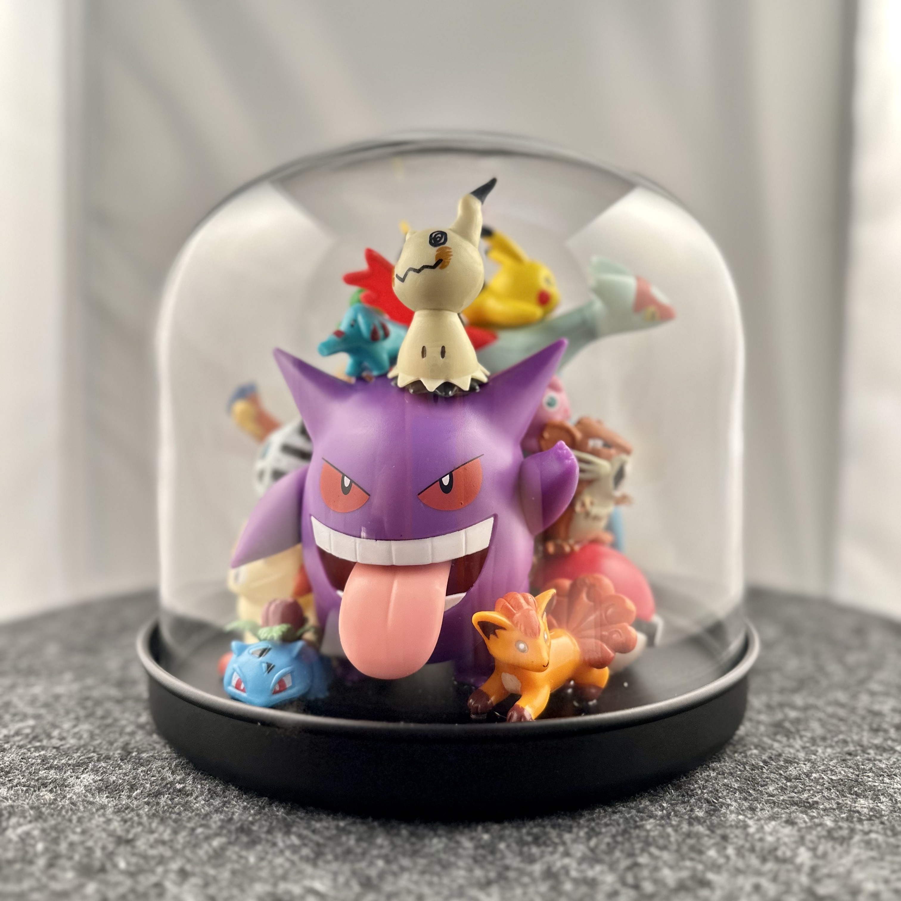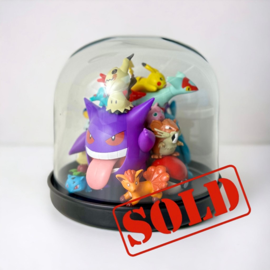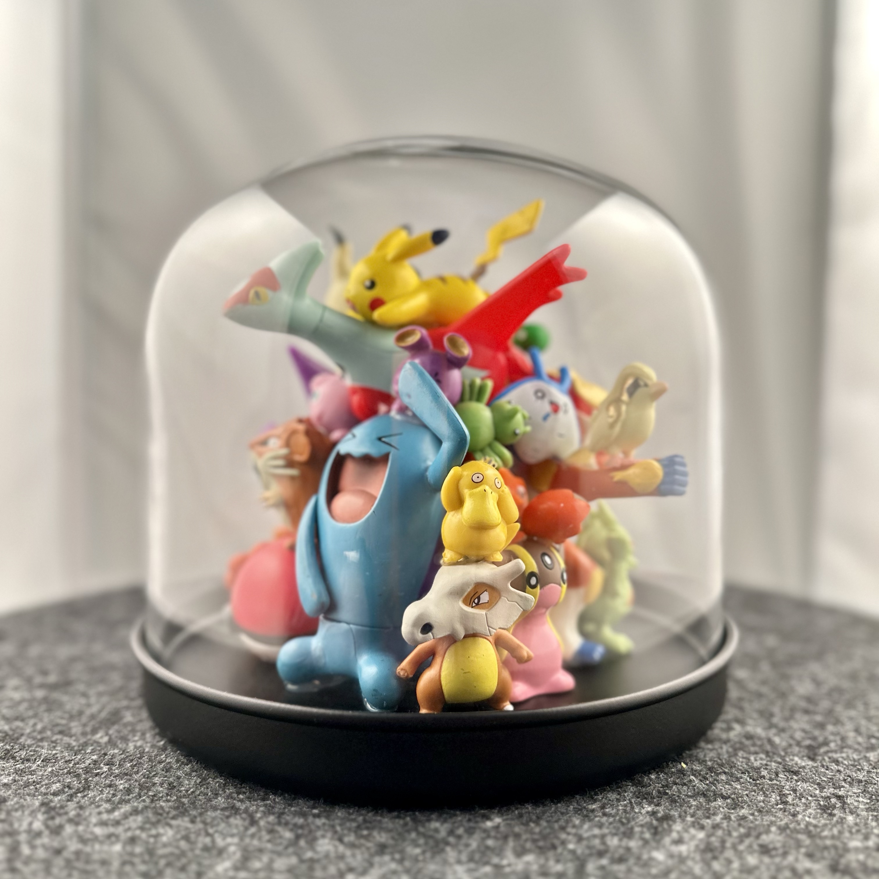 abstract collection of glued second-hand toys in a glass dome.