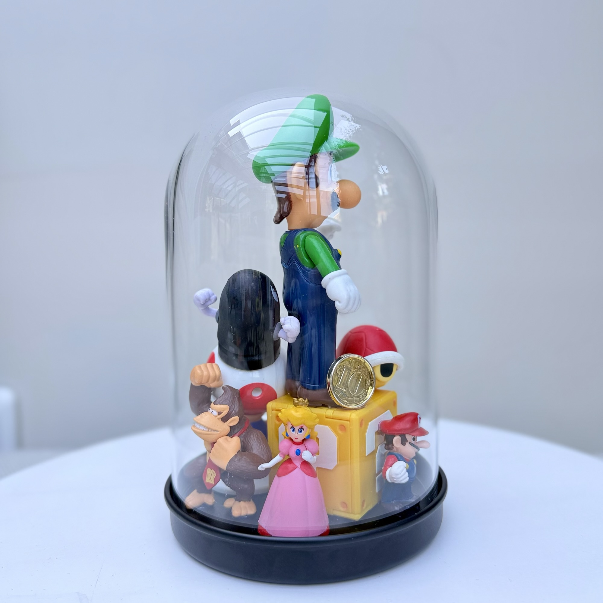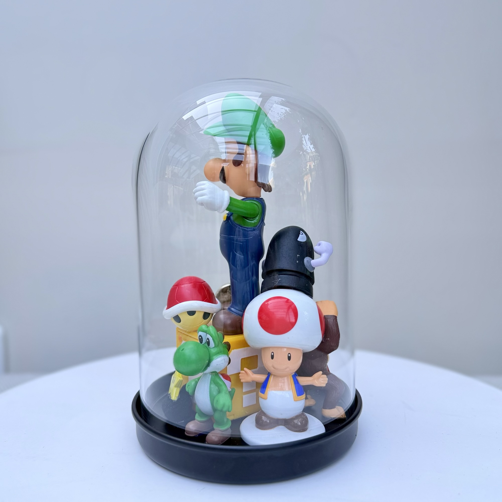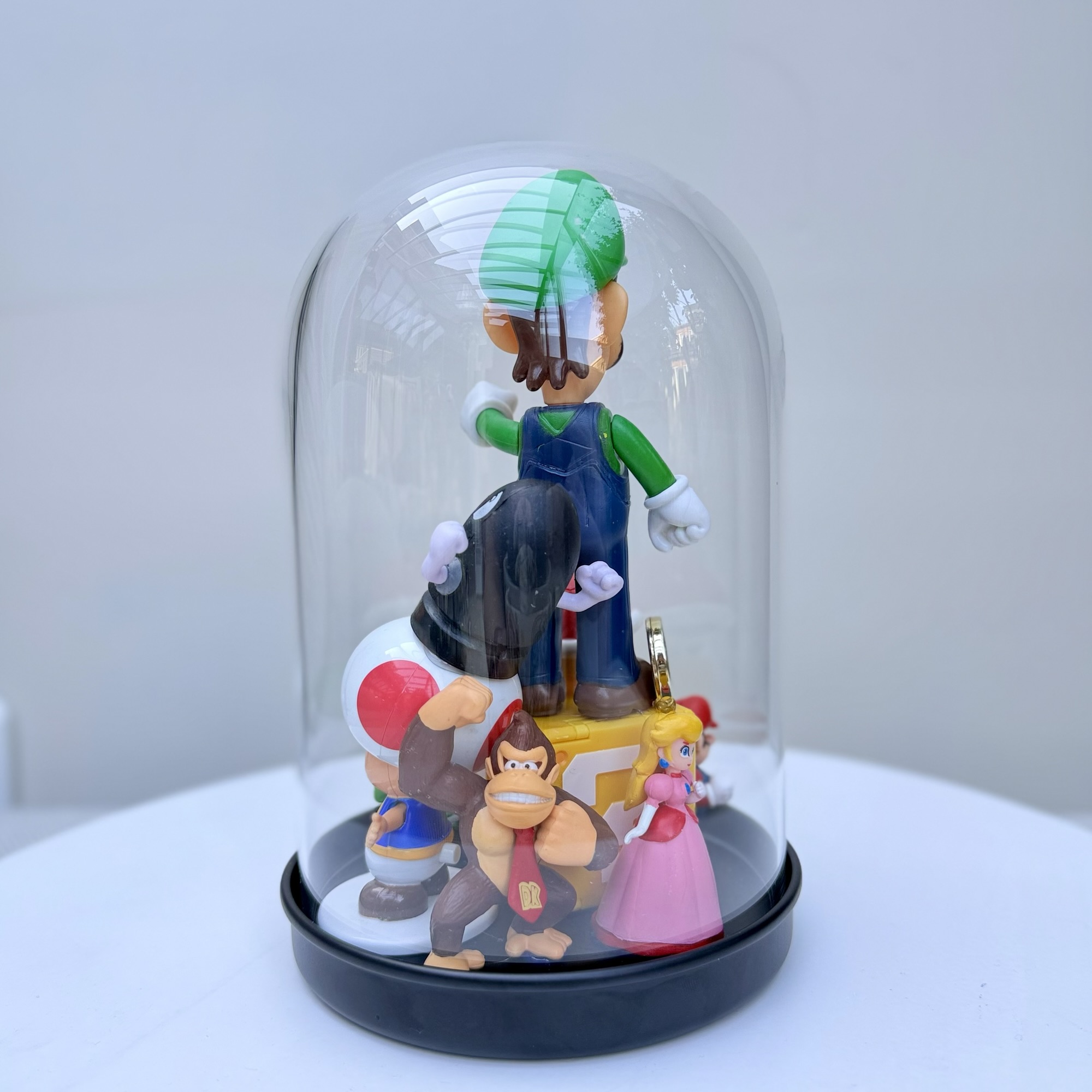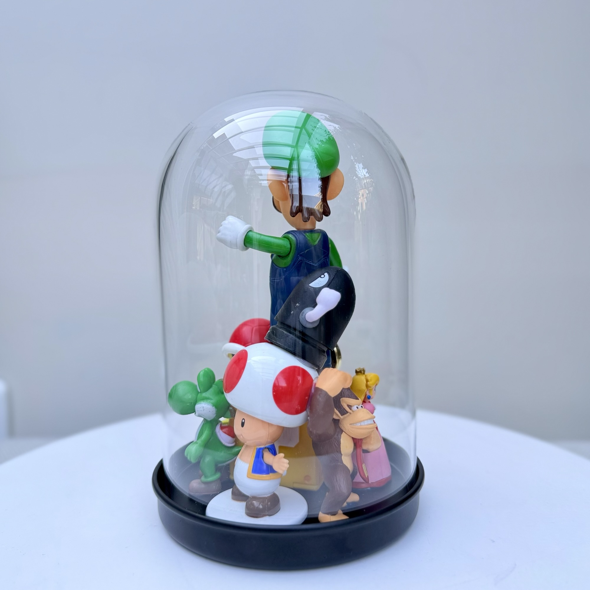 abstract collection of glued second-hand toys in a glass dome.