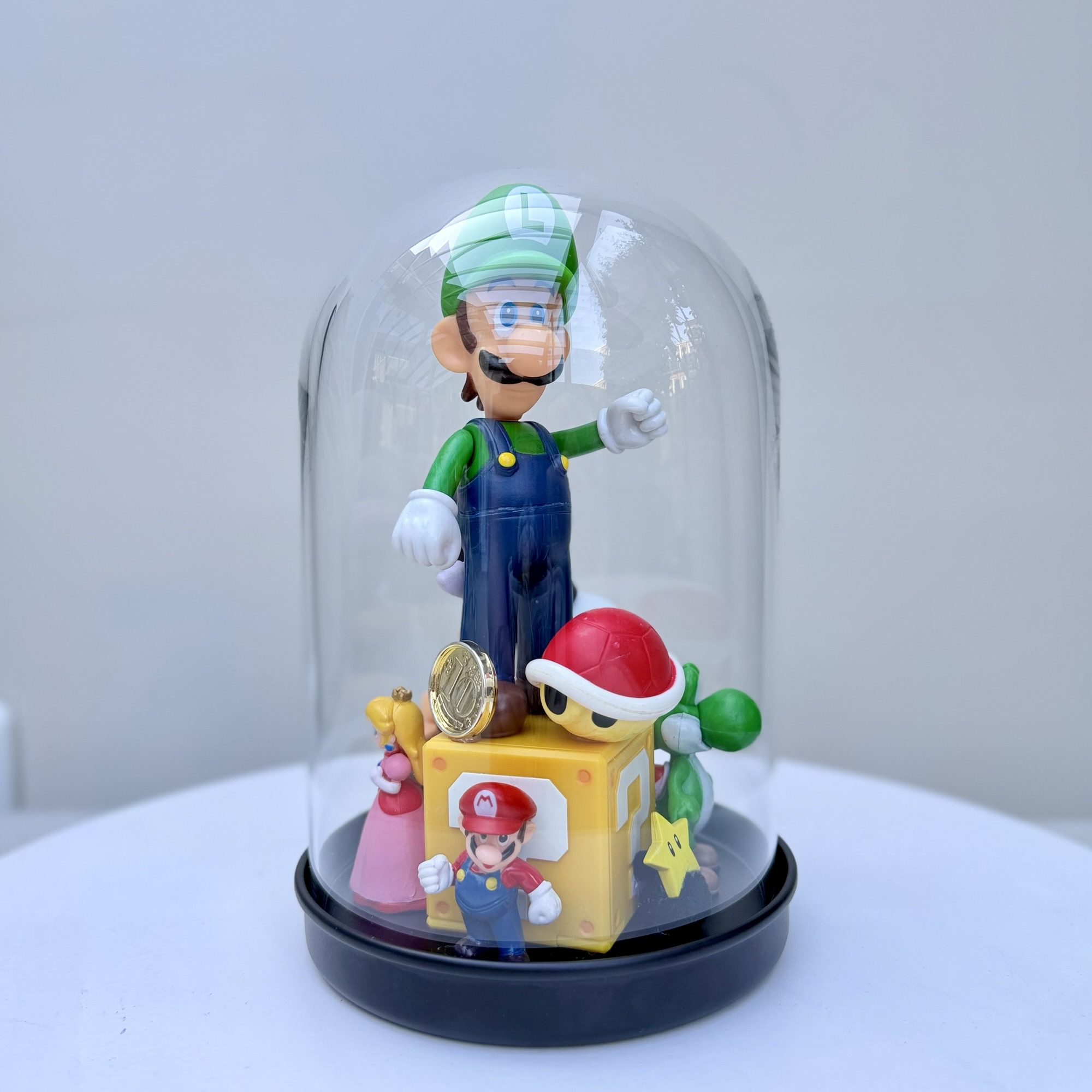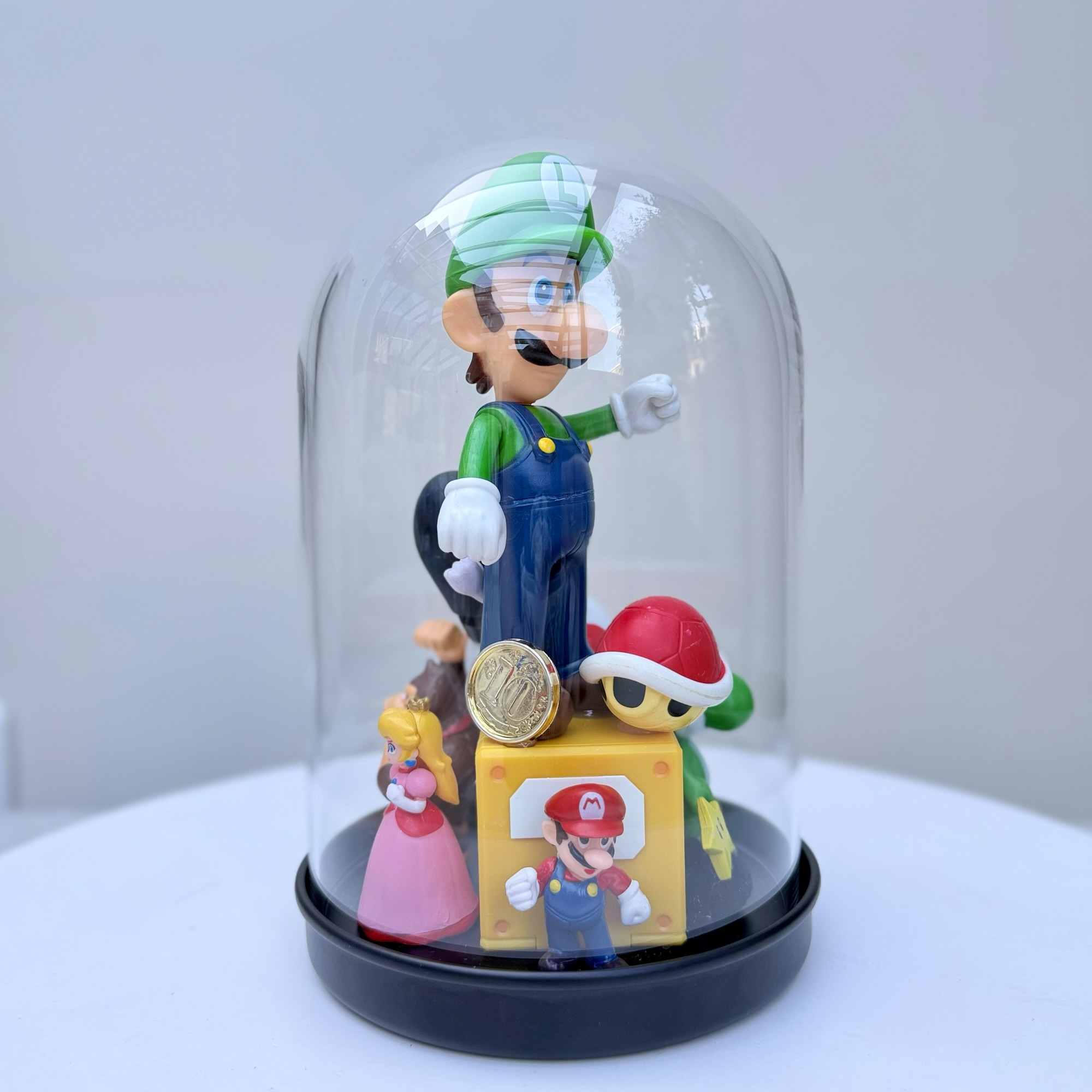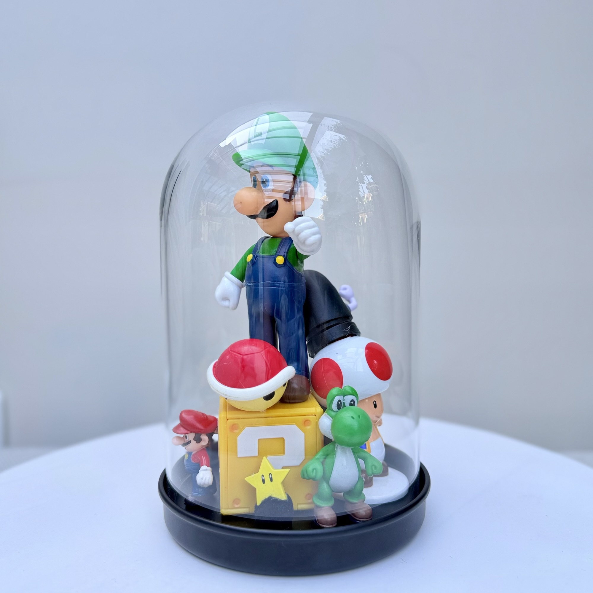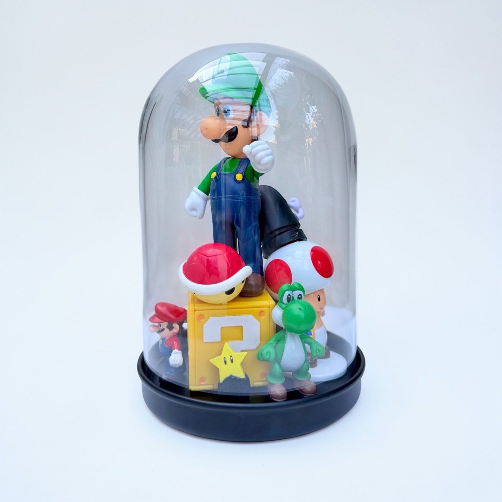 abstract collection of glued second-hand toys in a glass dome.