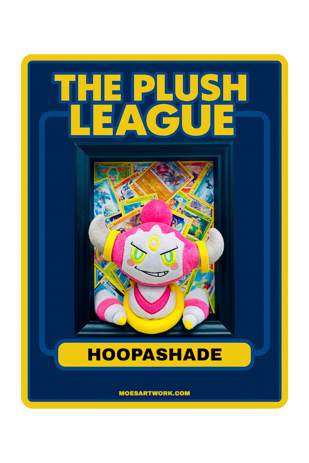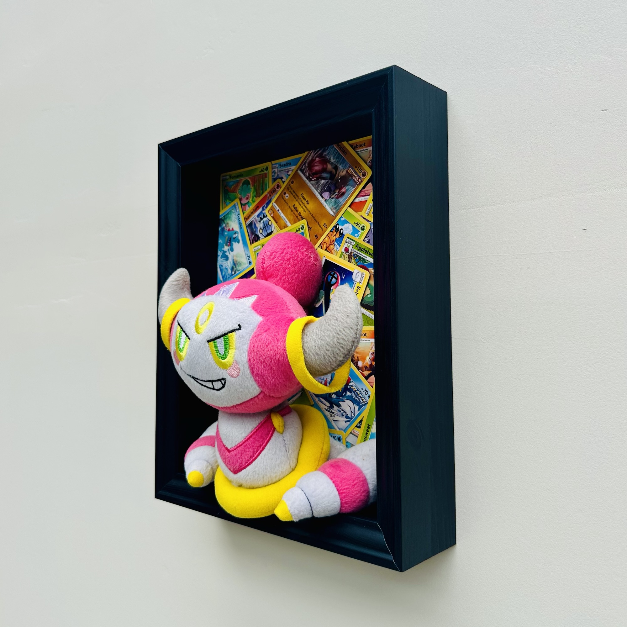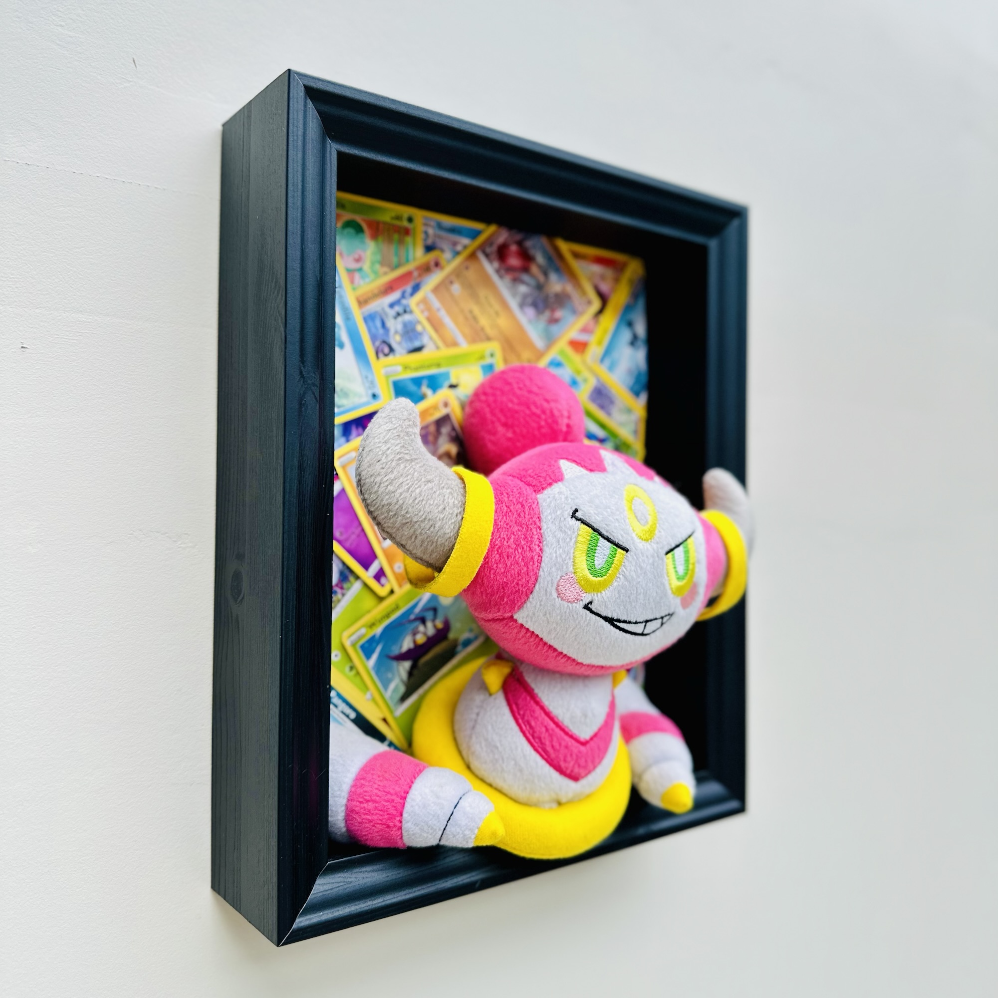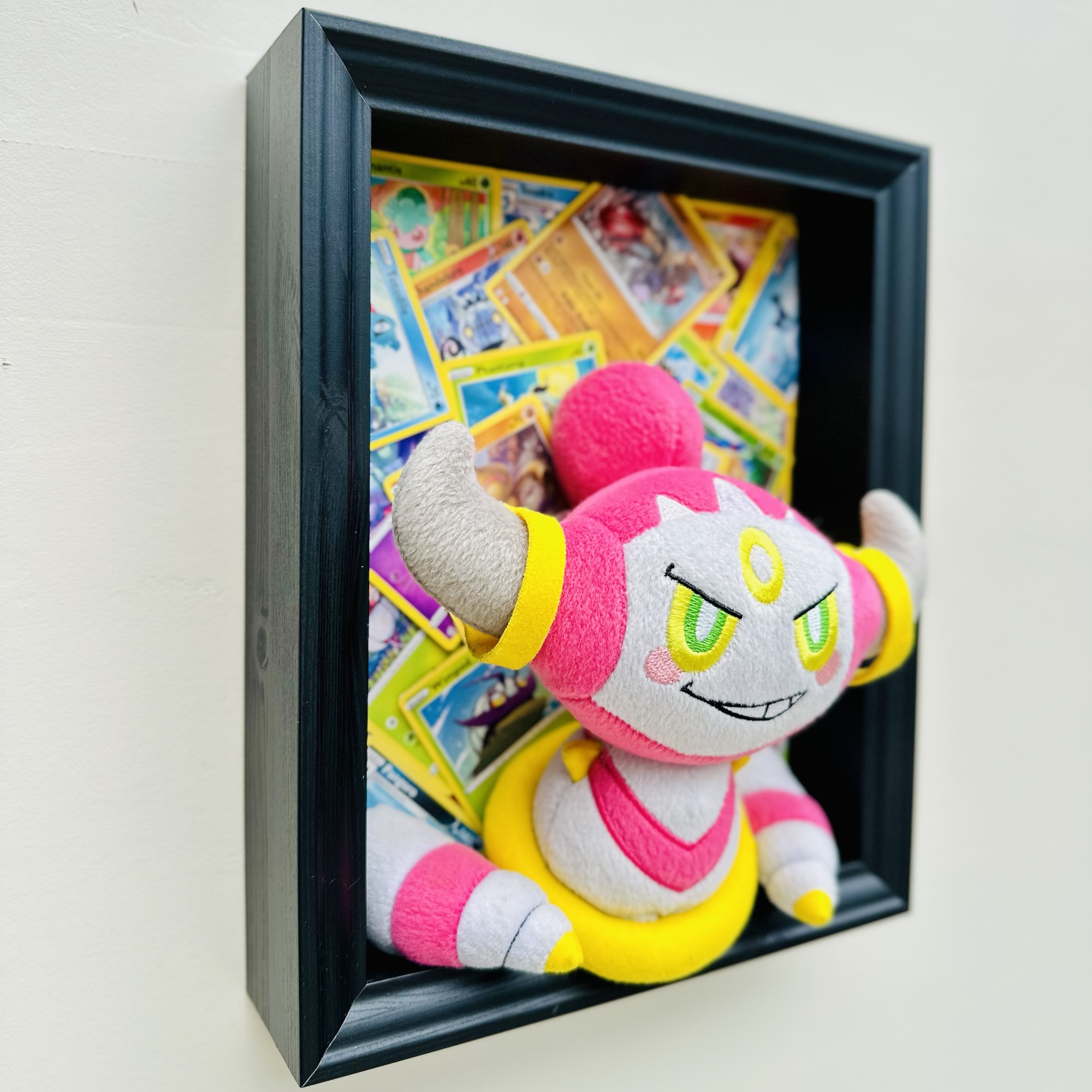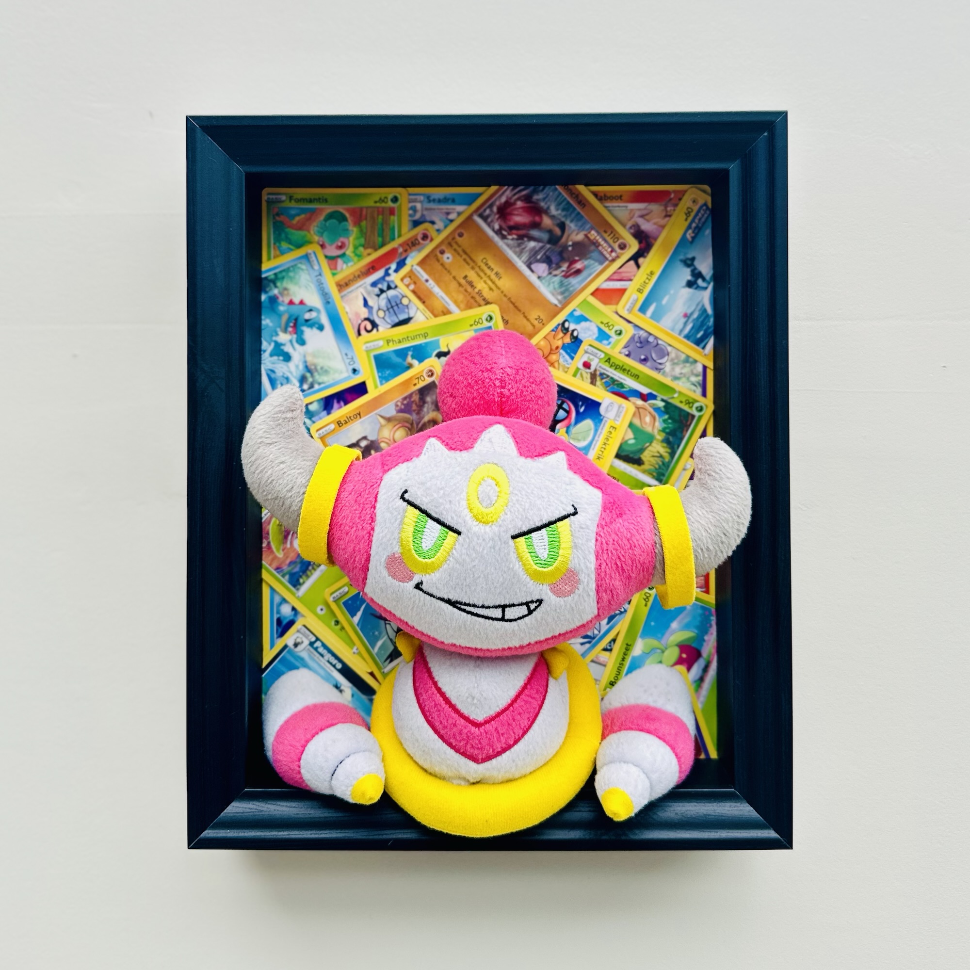 framed abstract collection of glued second-hand Hoopa (by Tomy) with original Pokémon cards.