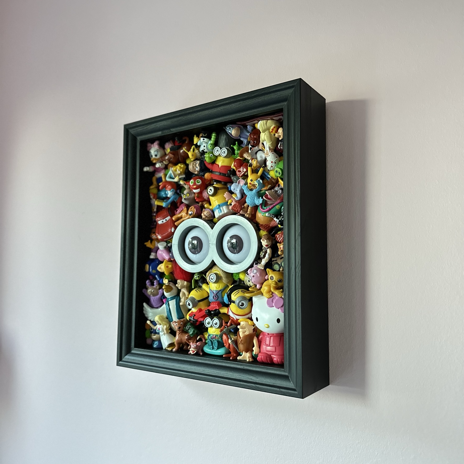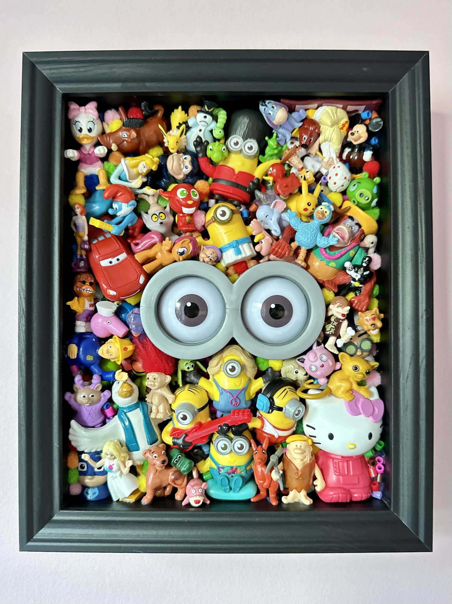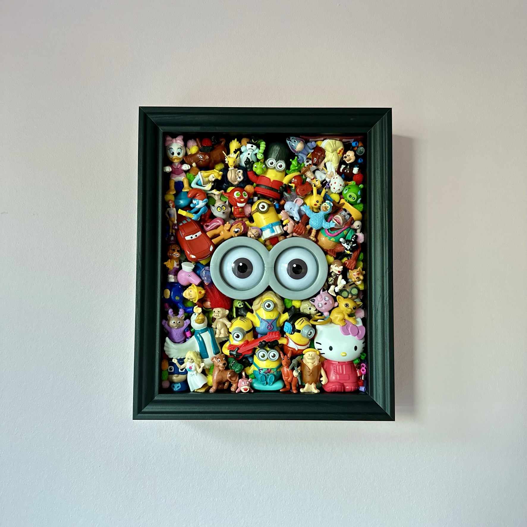 framed abstract collection of glued second-hand toys. frame can be used with or without plexiglass.