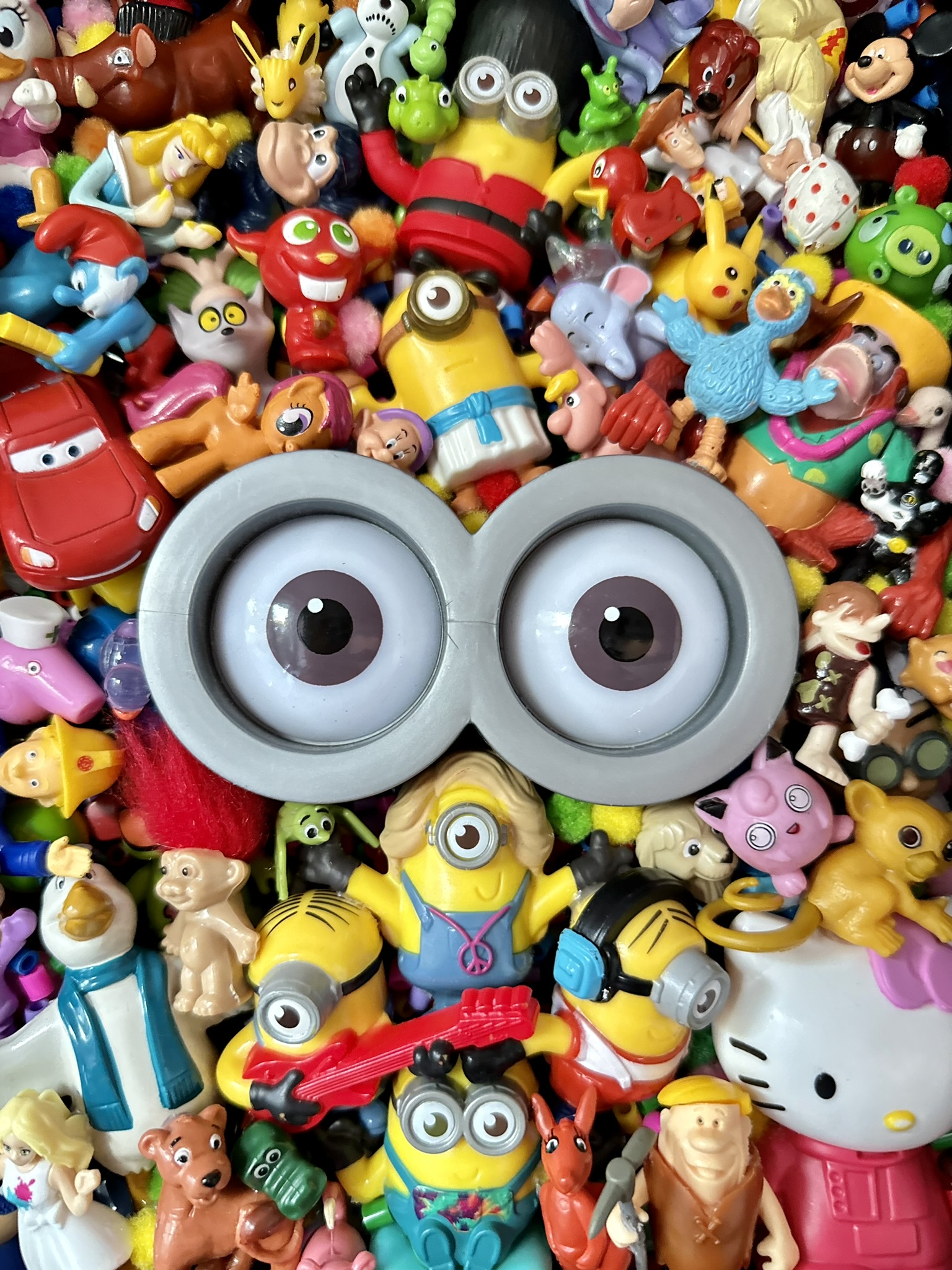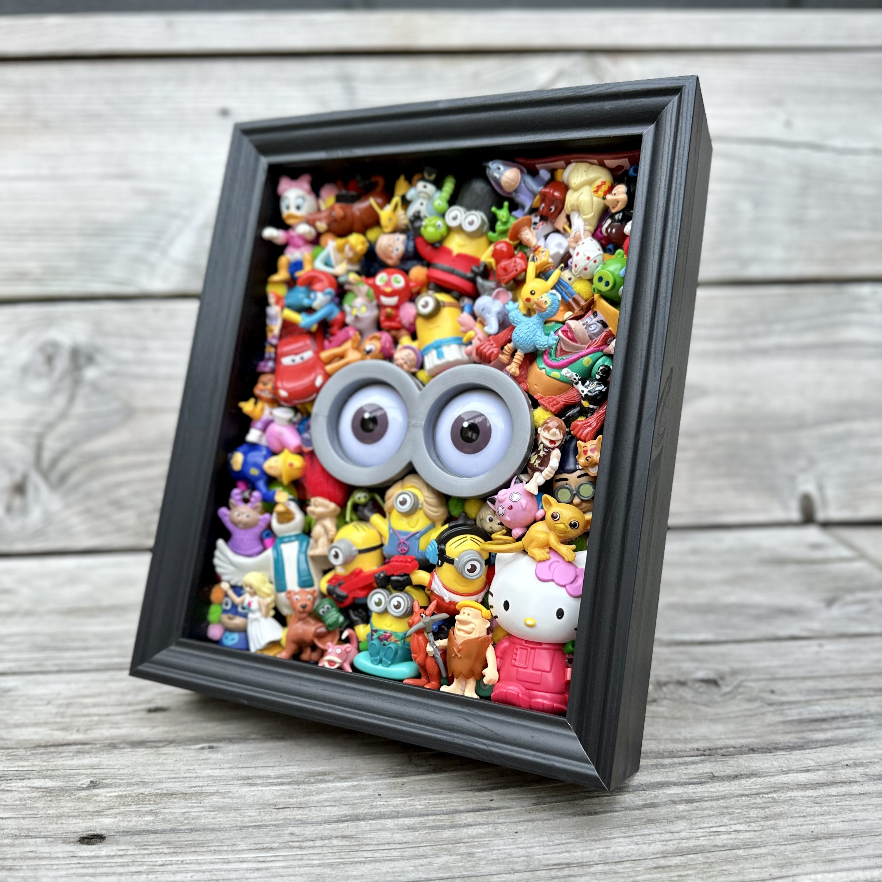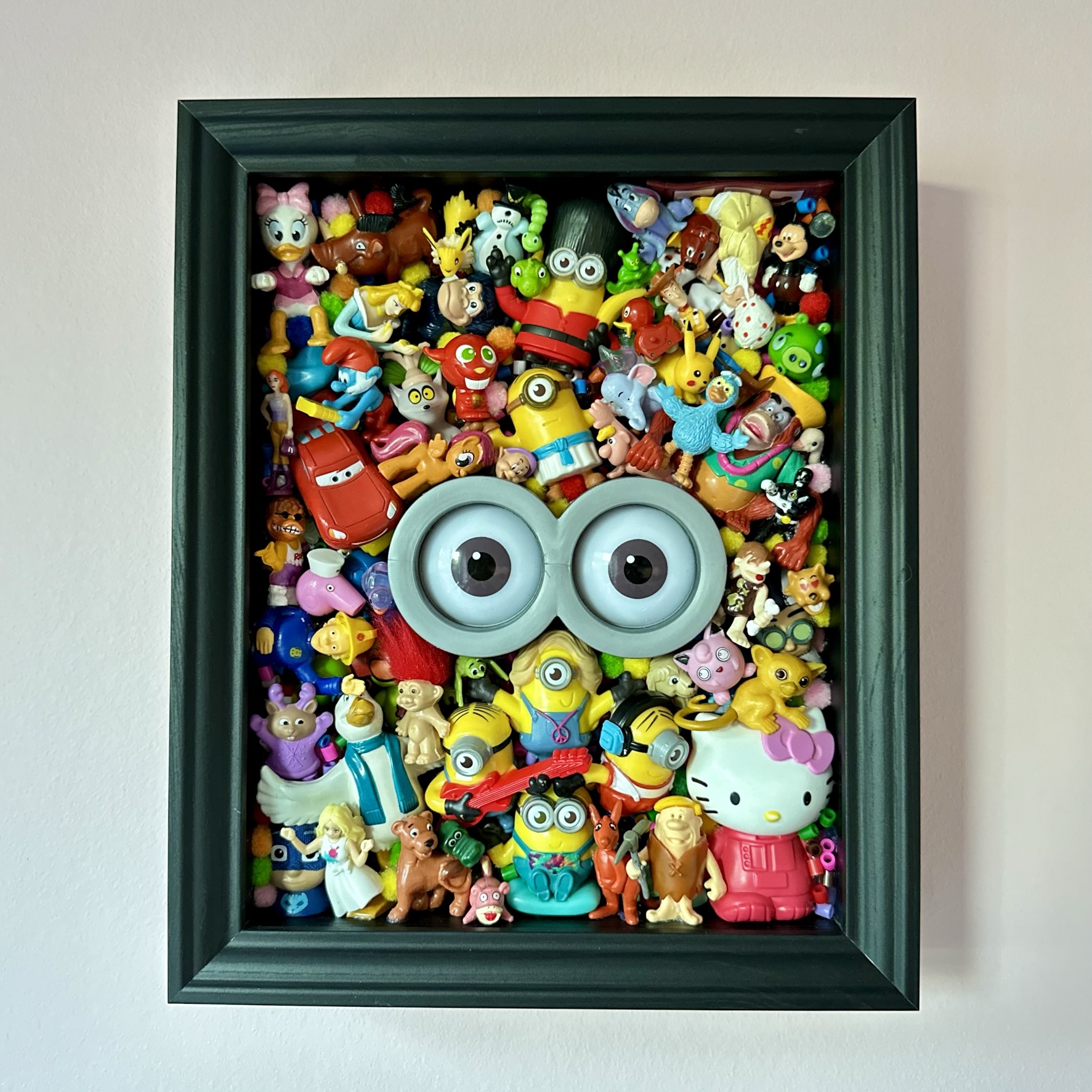 framed abstract collection of glued second-hand toys. frame can be used with or without plexiglass.