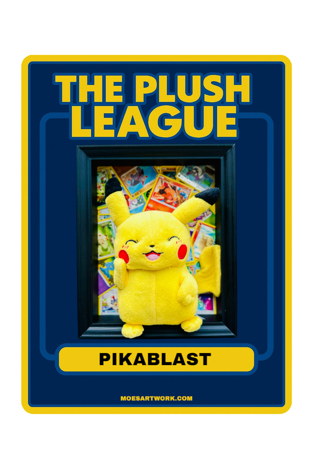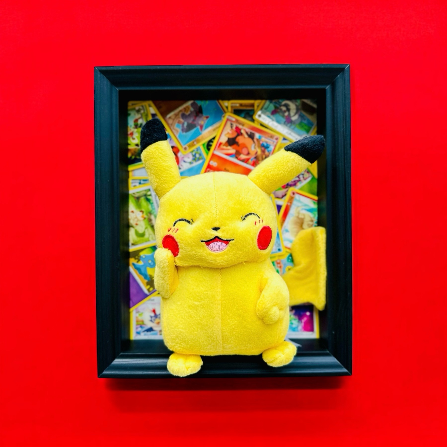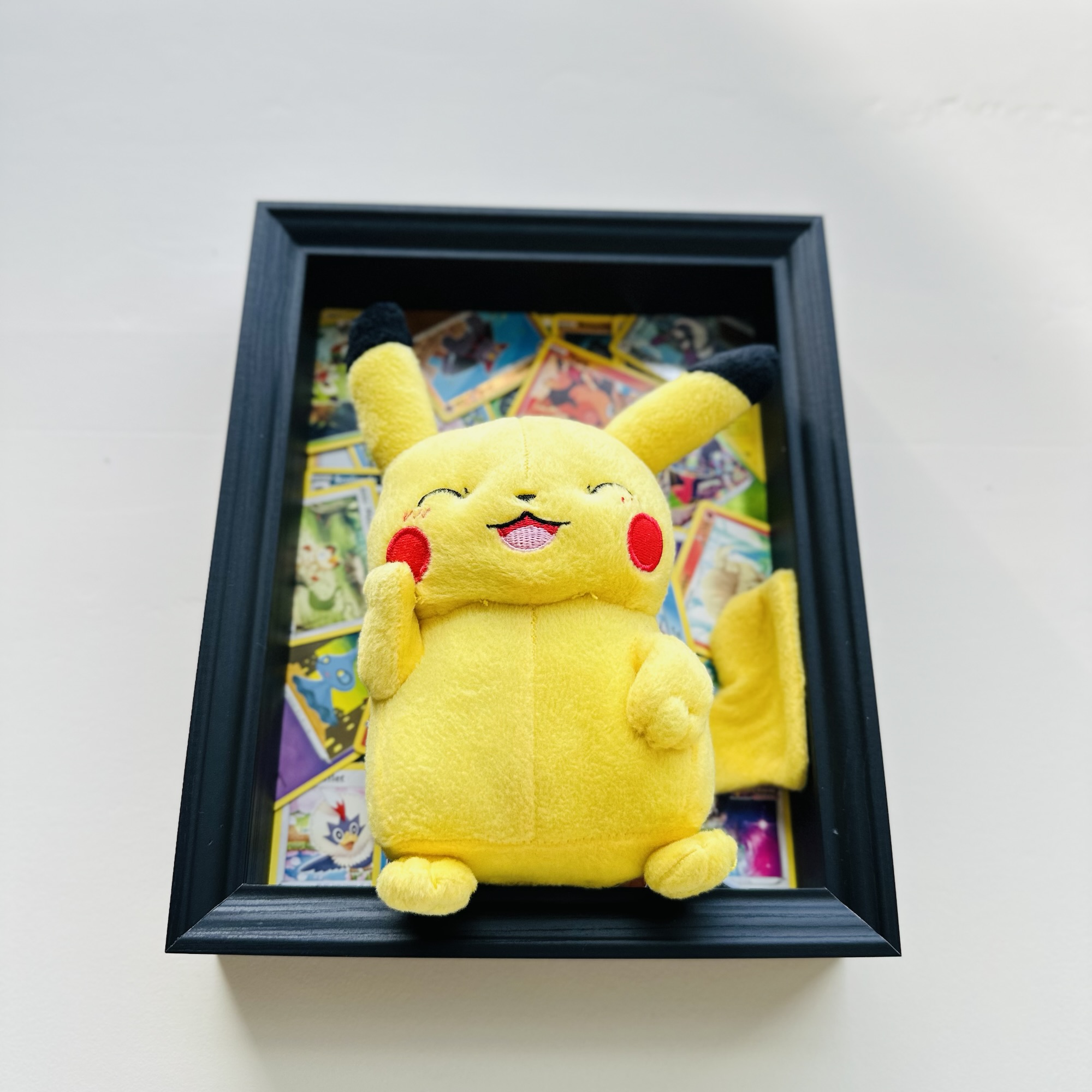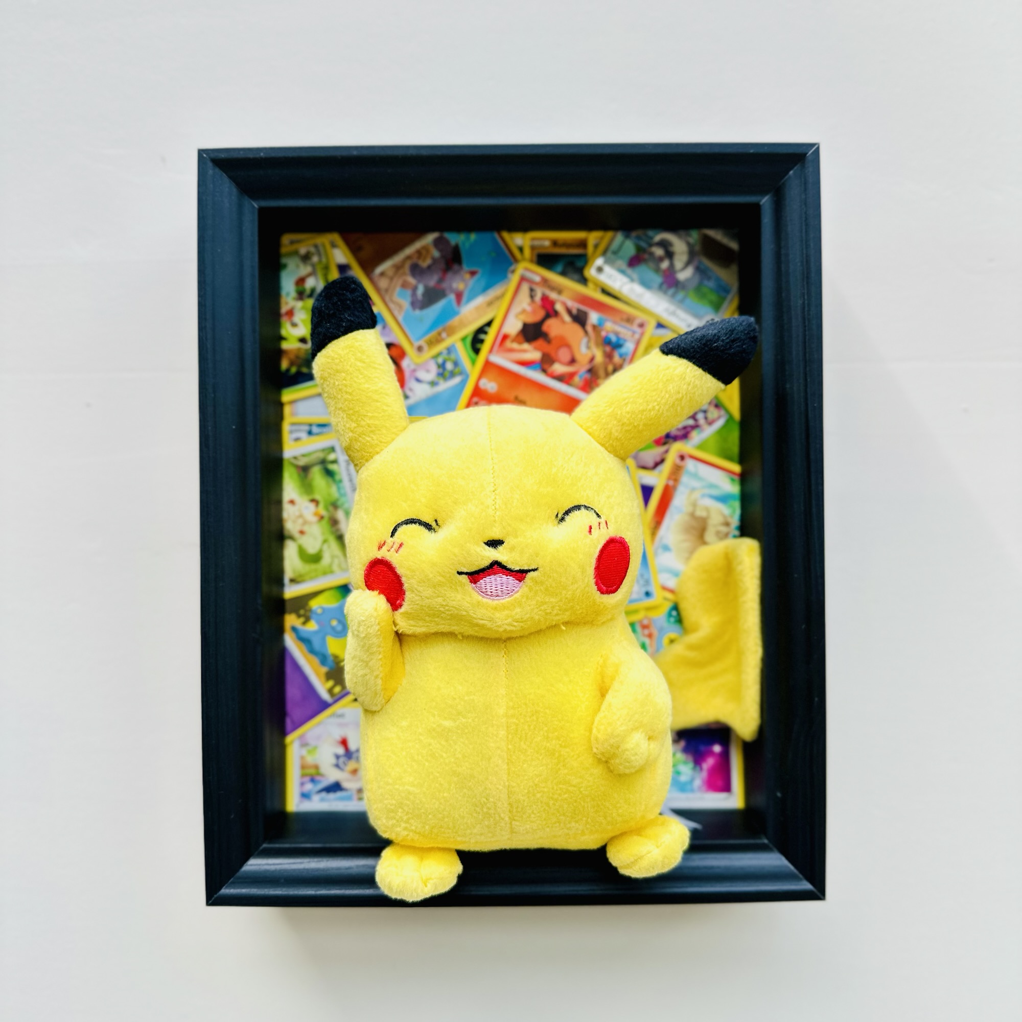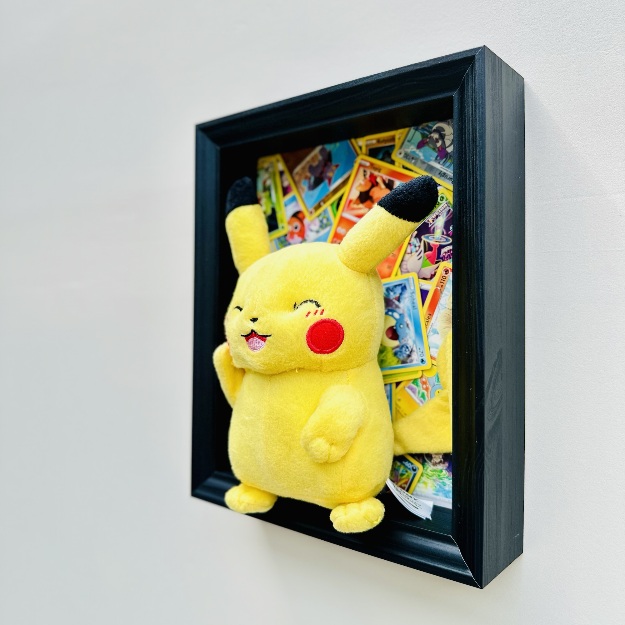 framed abstract collection of glued second-hand Pikachu (by Tomy) with original Pokémon cards.