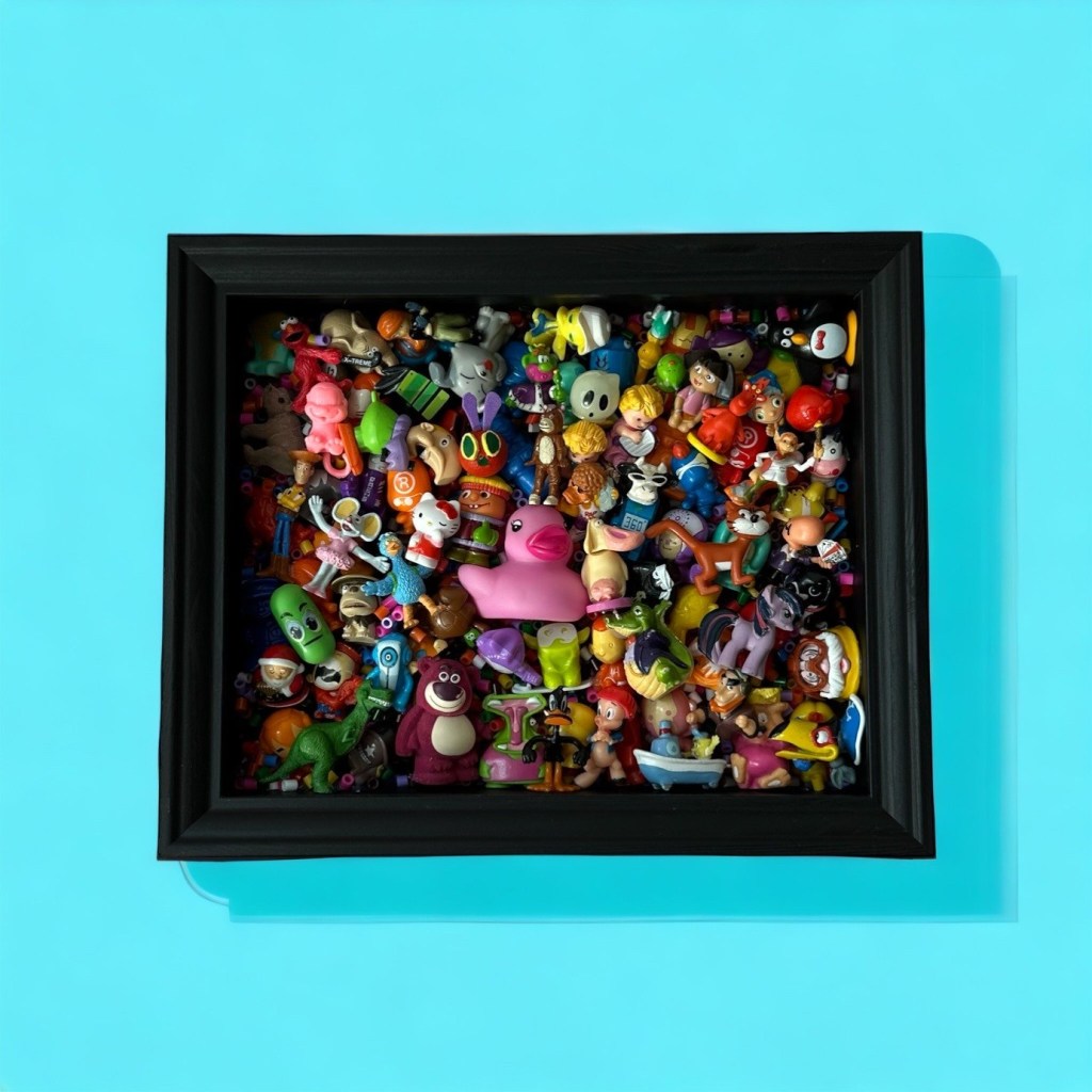 DESCRIPTION: framed abstract collection of glued second-hand toys