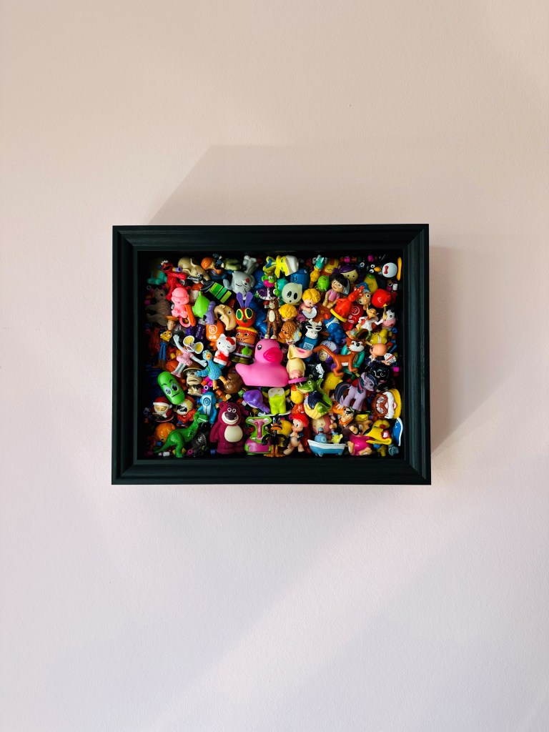 TITLE: “Duck Mania”YEAR: 2023DIMENSIONS: 25 x 20 x 6 cmDESCRIPTION: framed abstract collection of glued second-hand toys