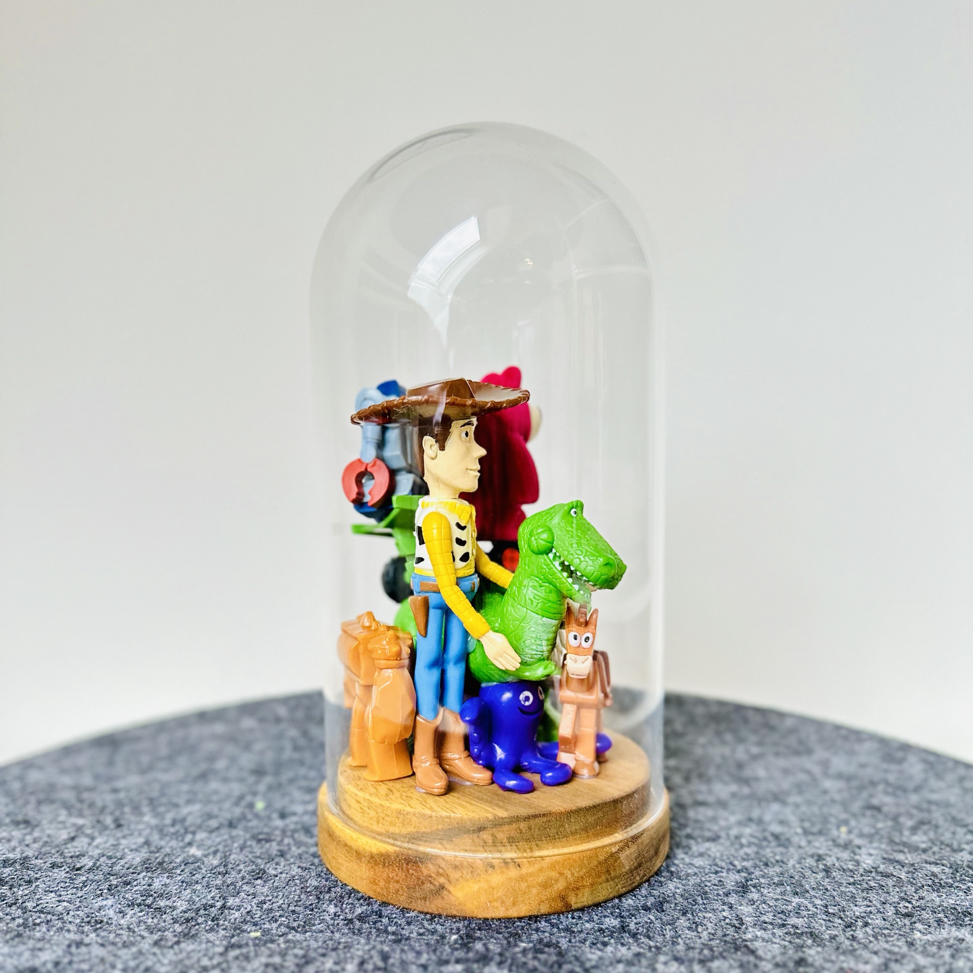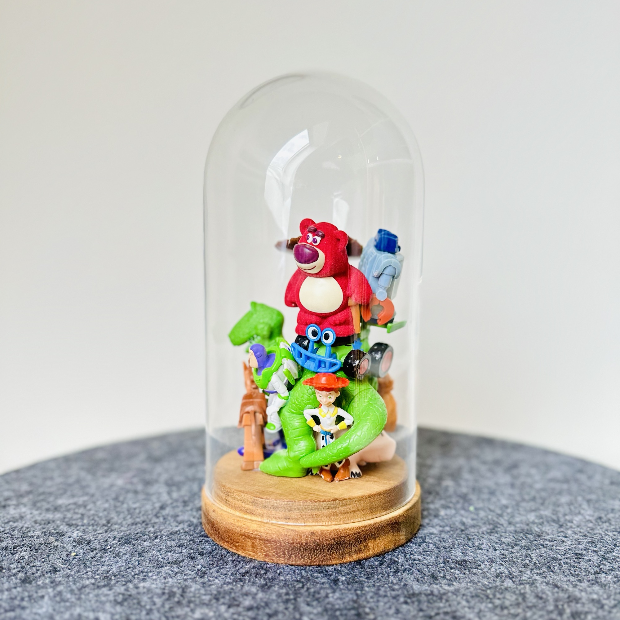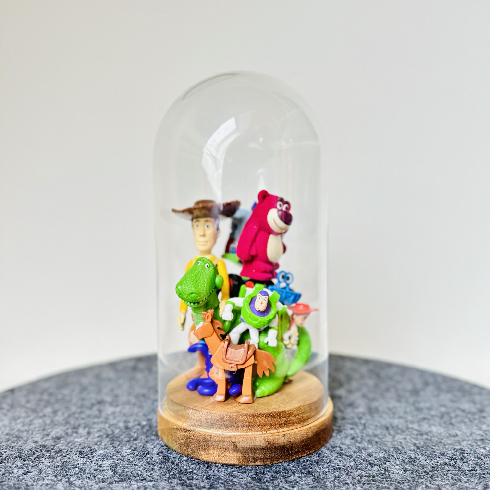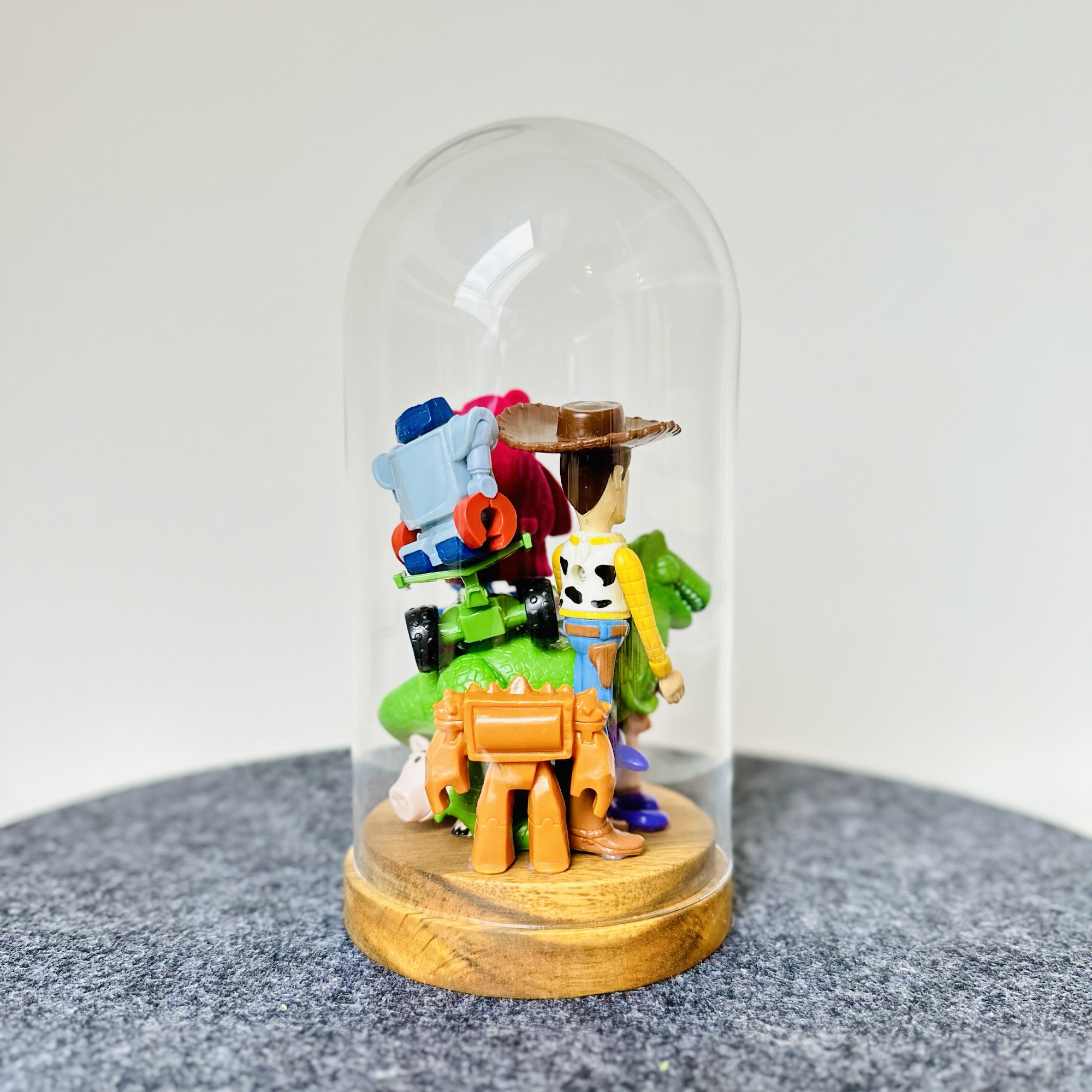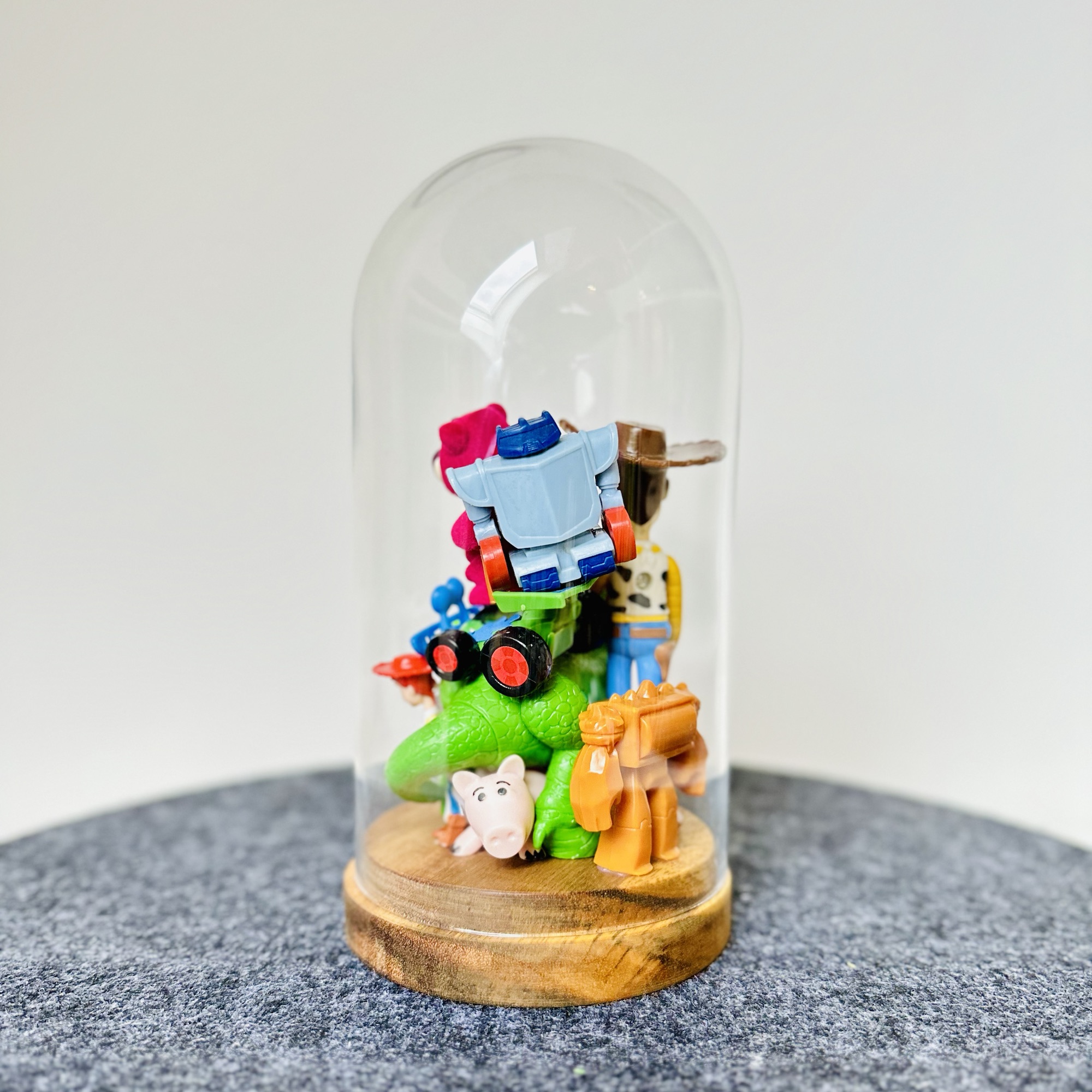 abstract collection of glued second-hand toys in a glass dome.