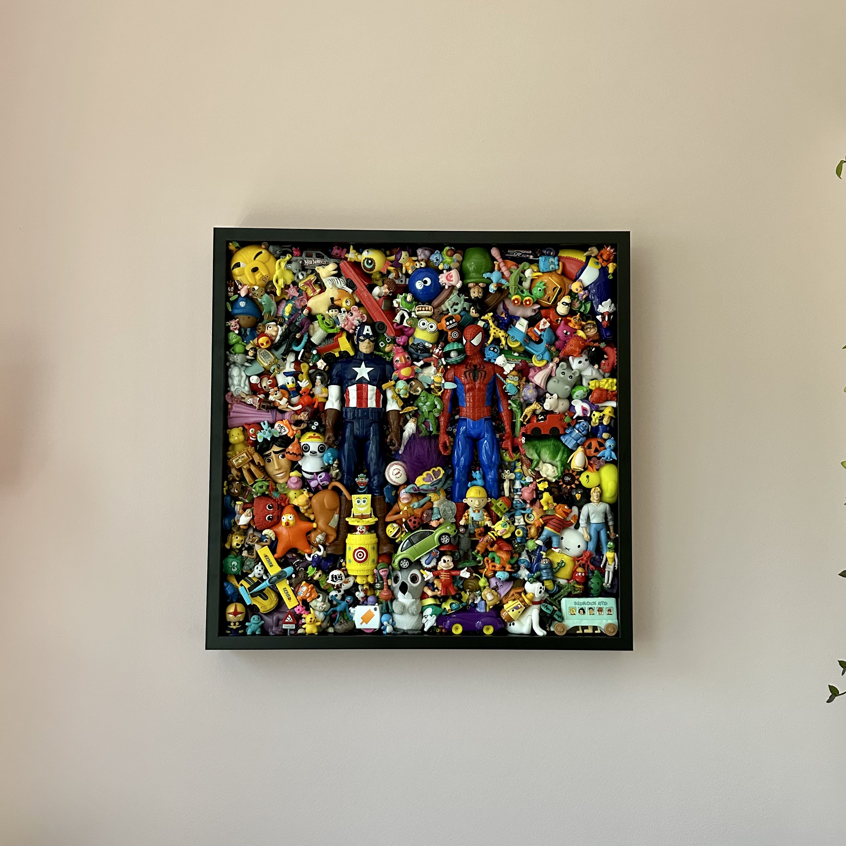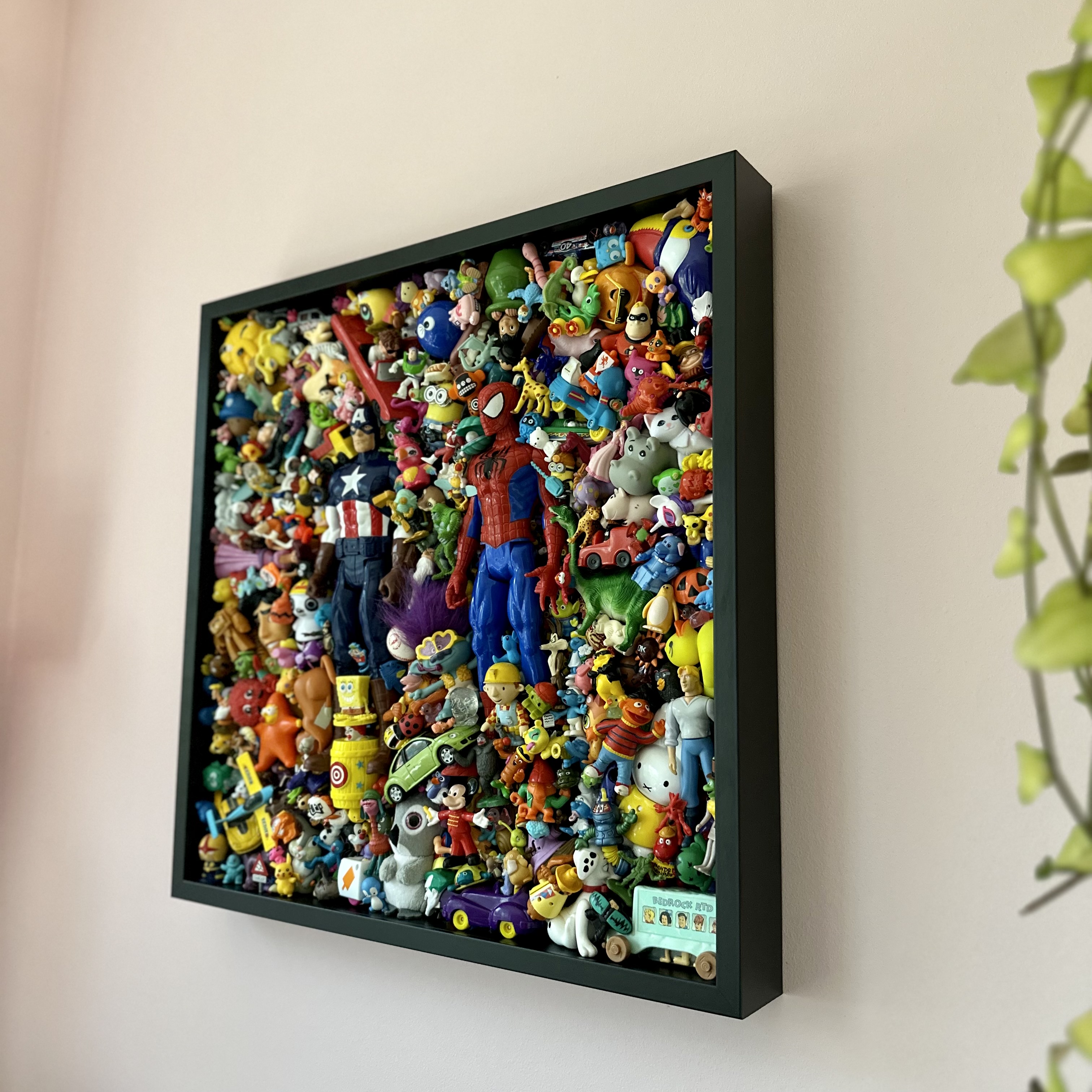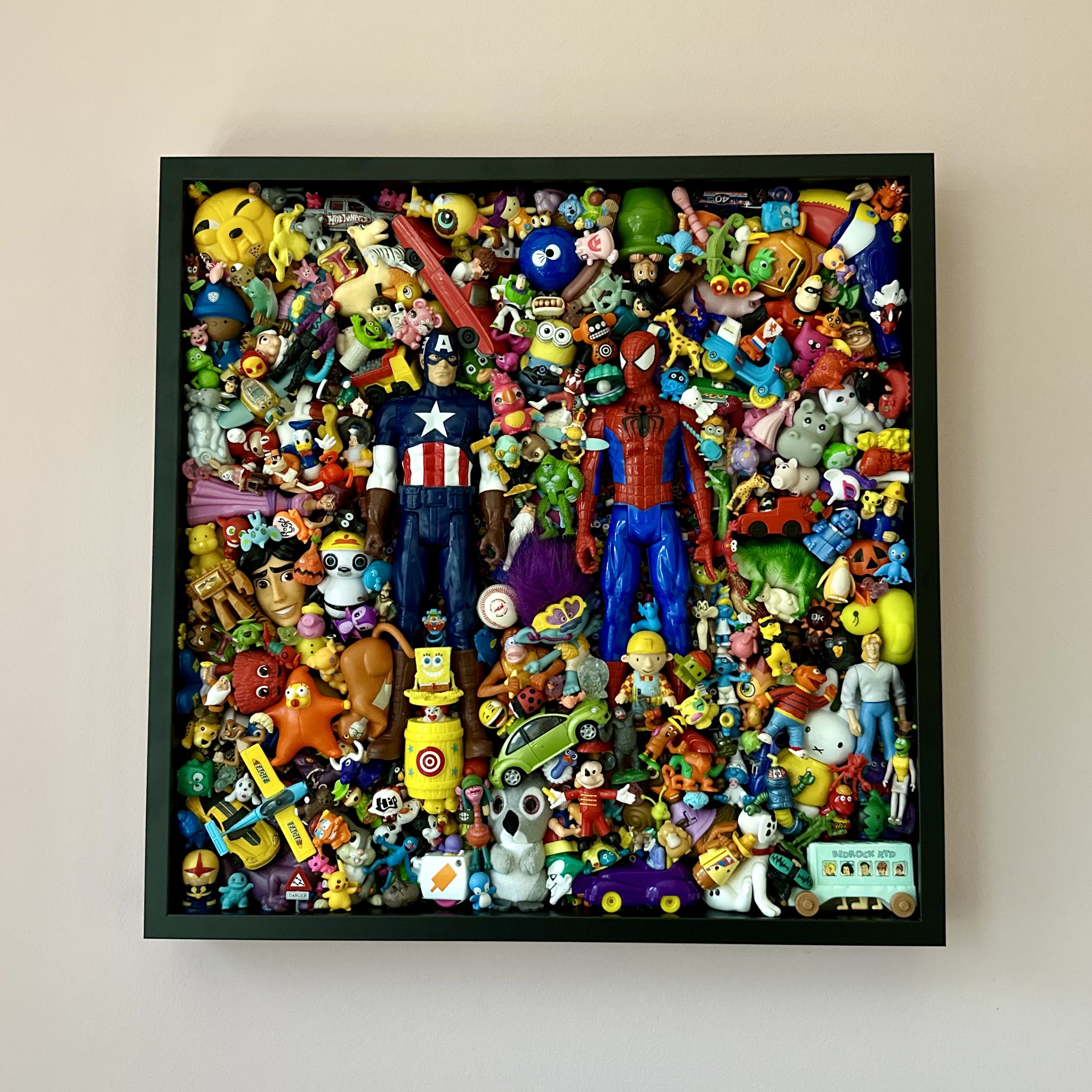 framed abstract collection of glued second-hand toys. frame can be used with or without plexiglass.