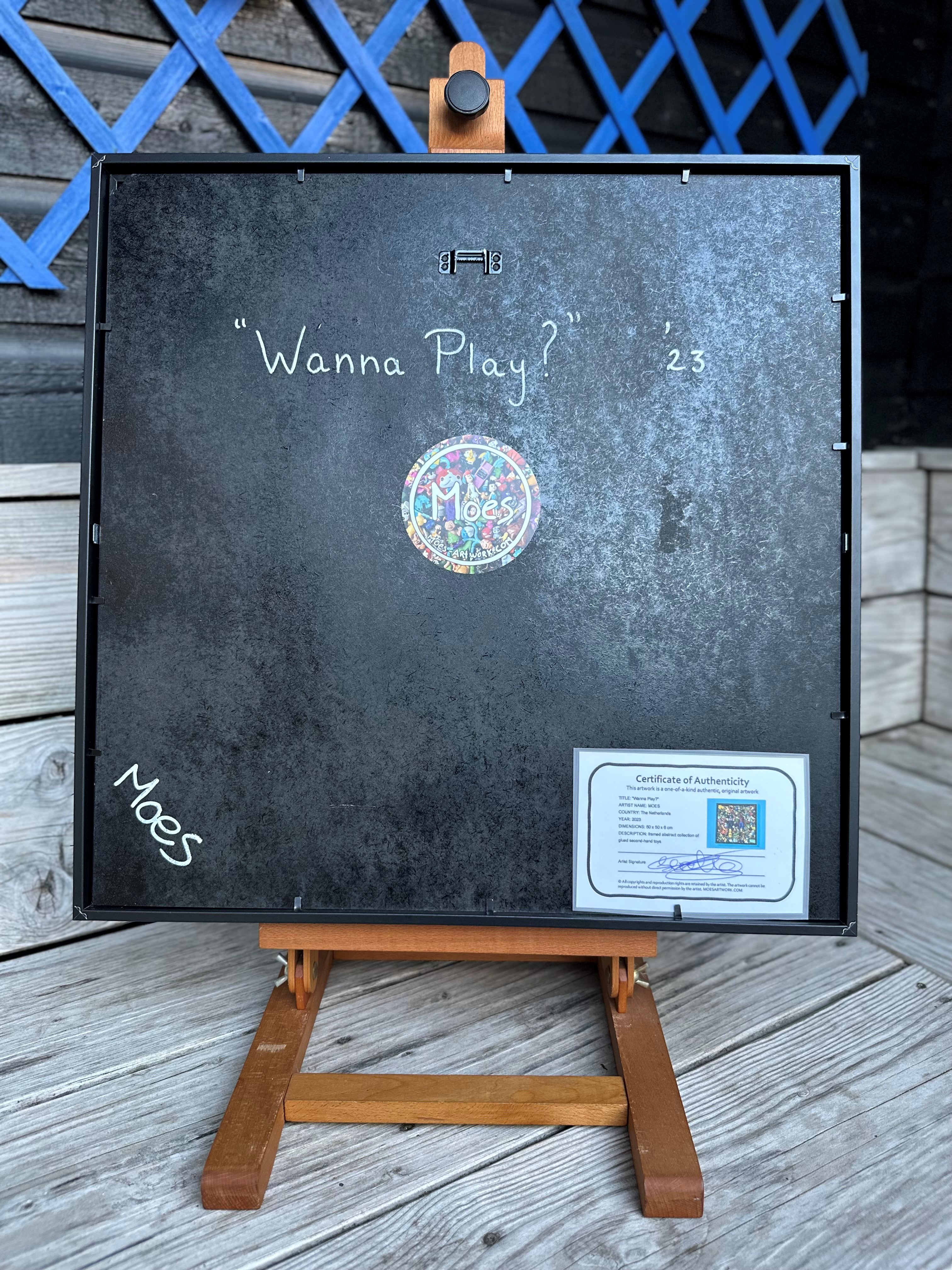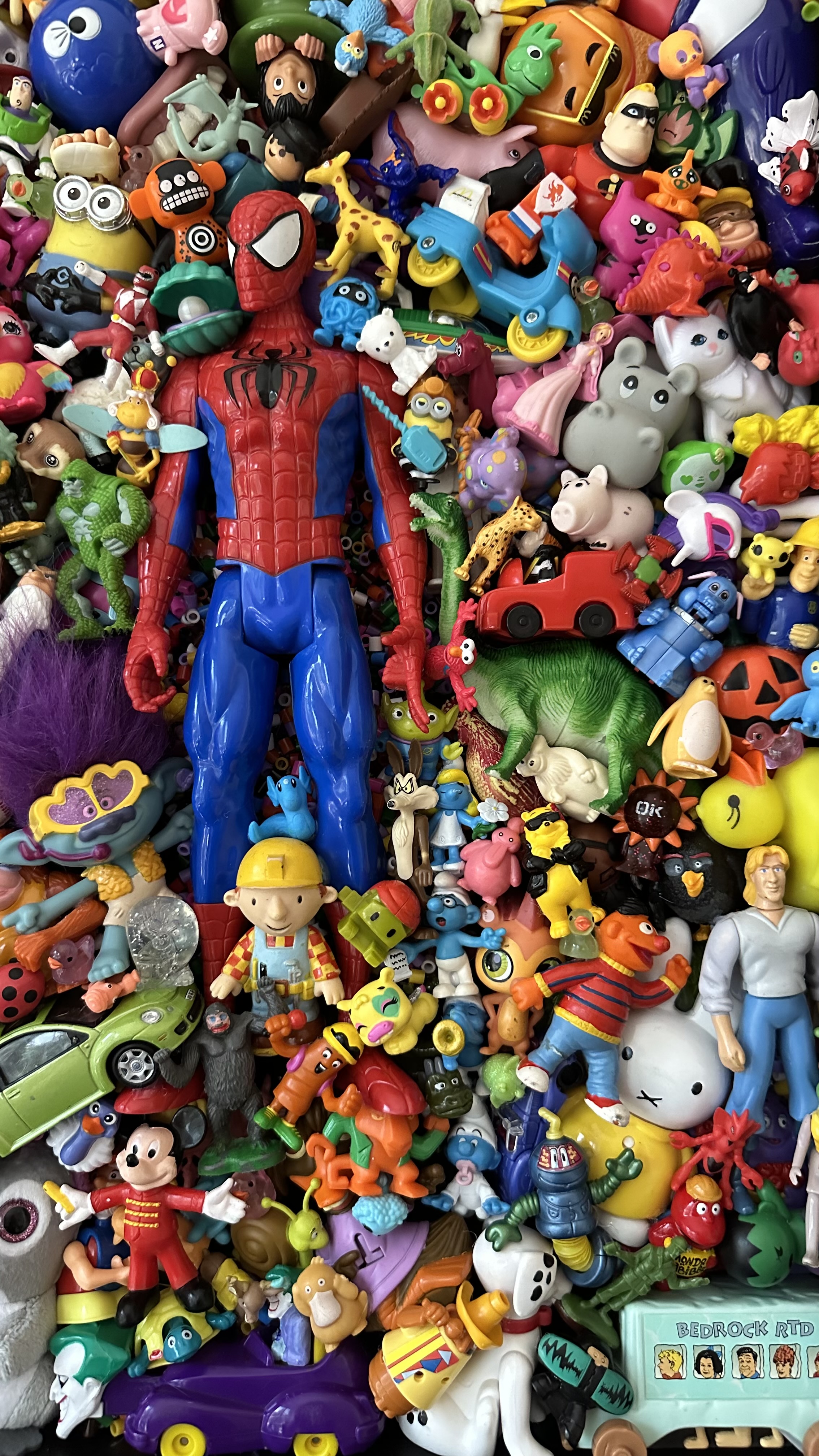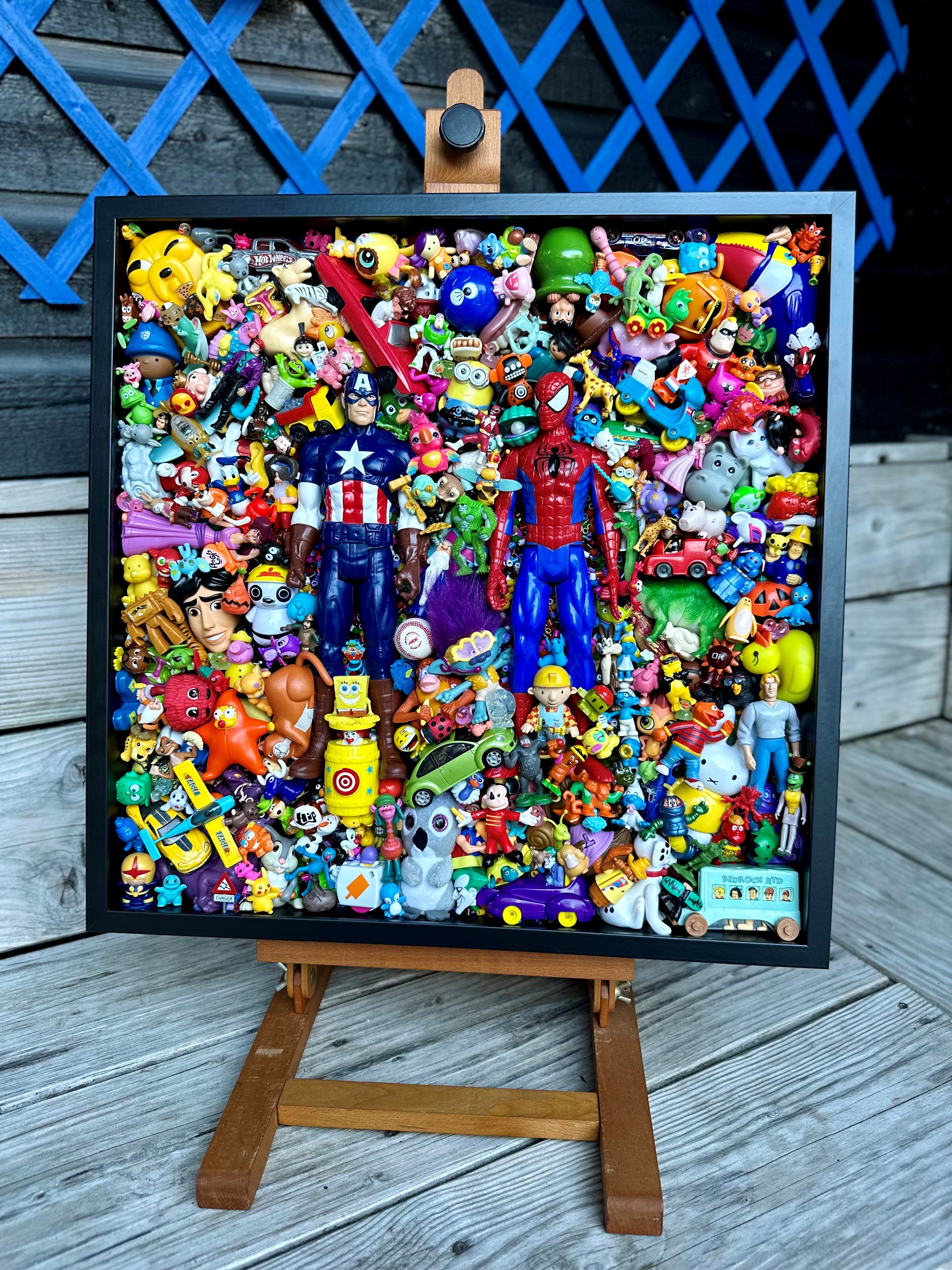 framed abstract collection of glued second-hand toys. frame can be used with or without plexiglass.