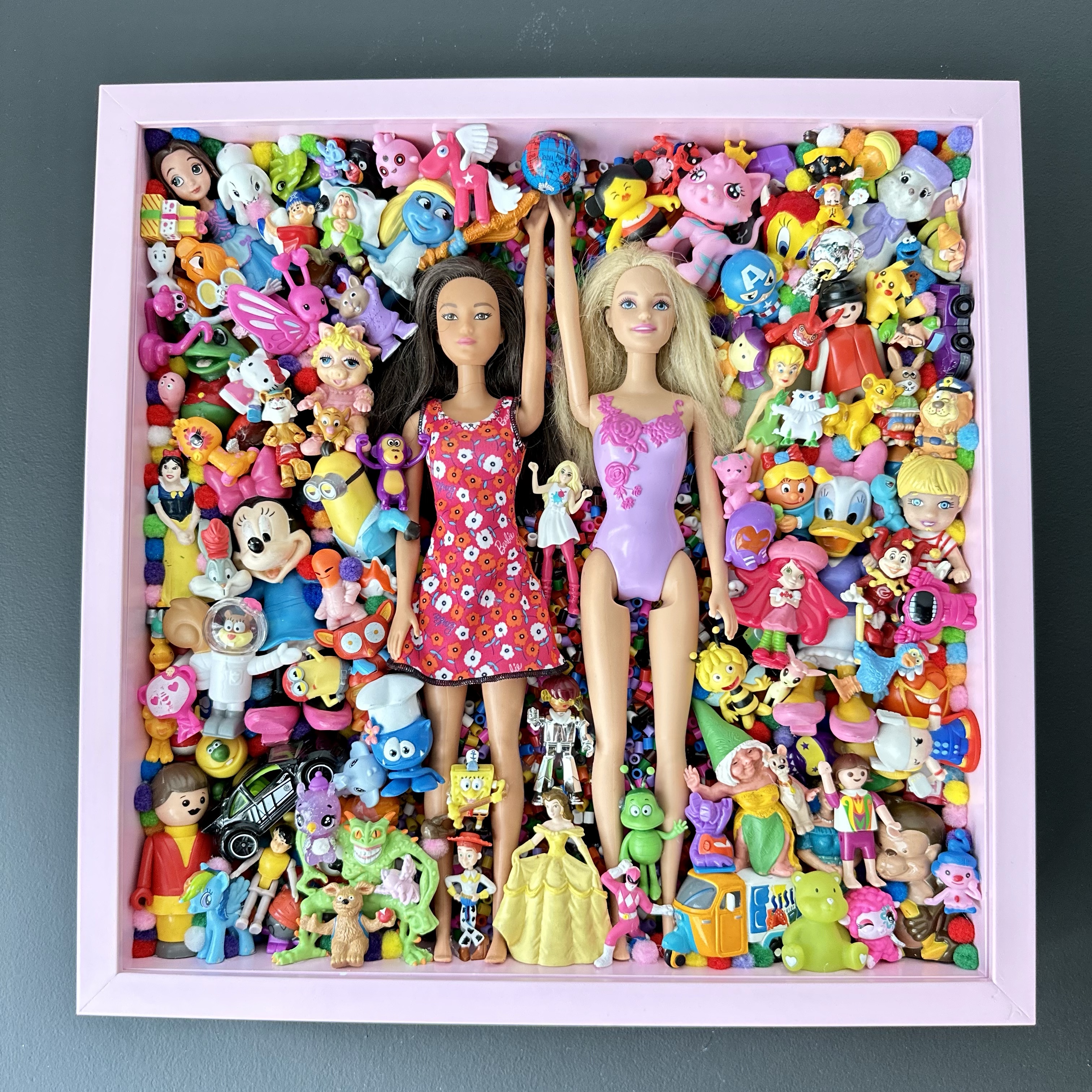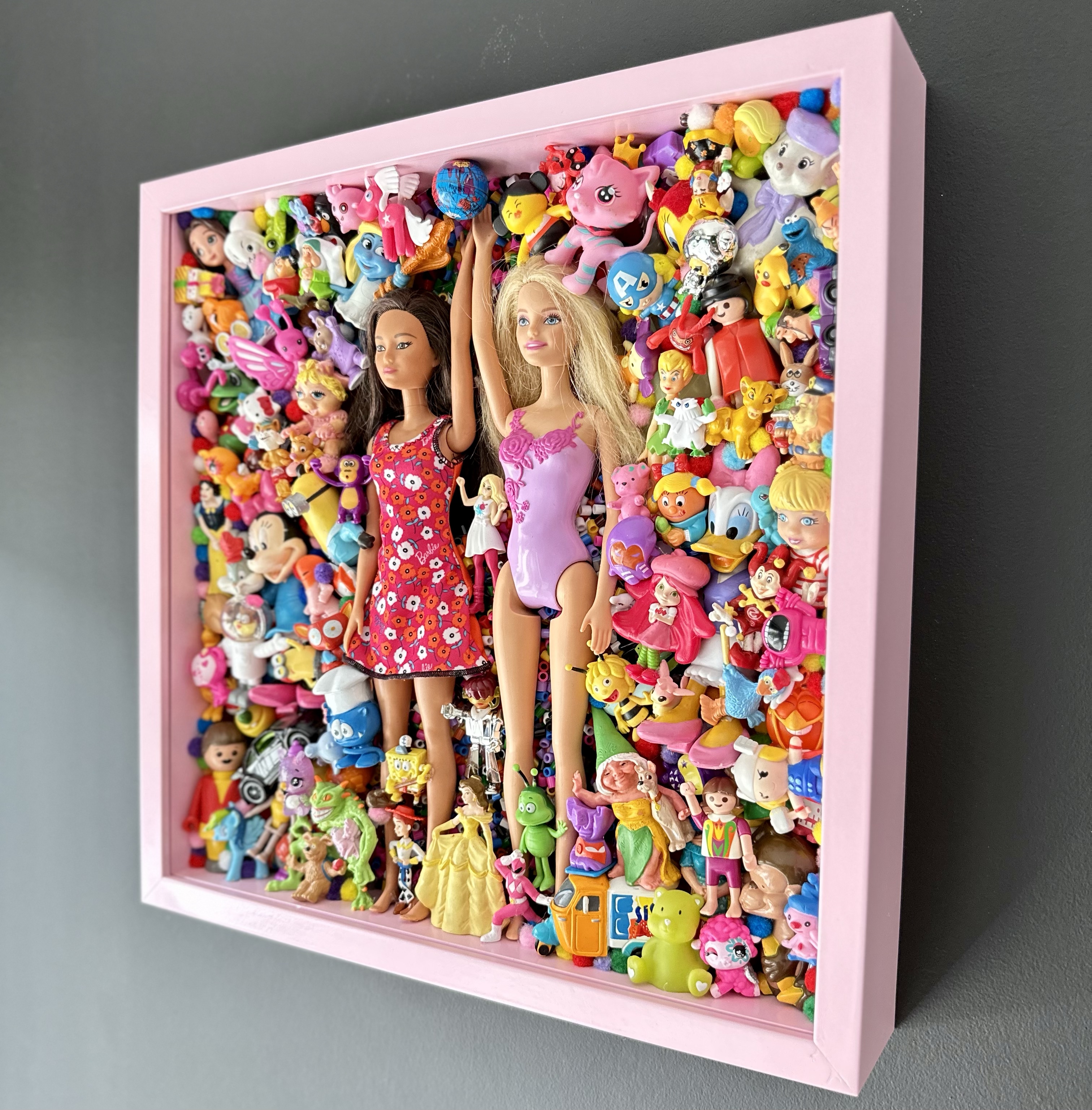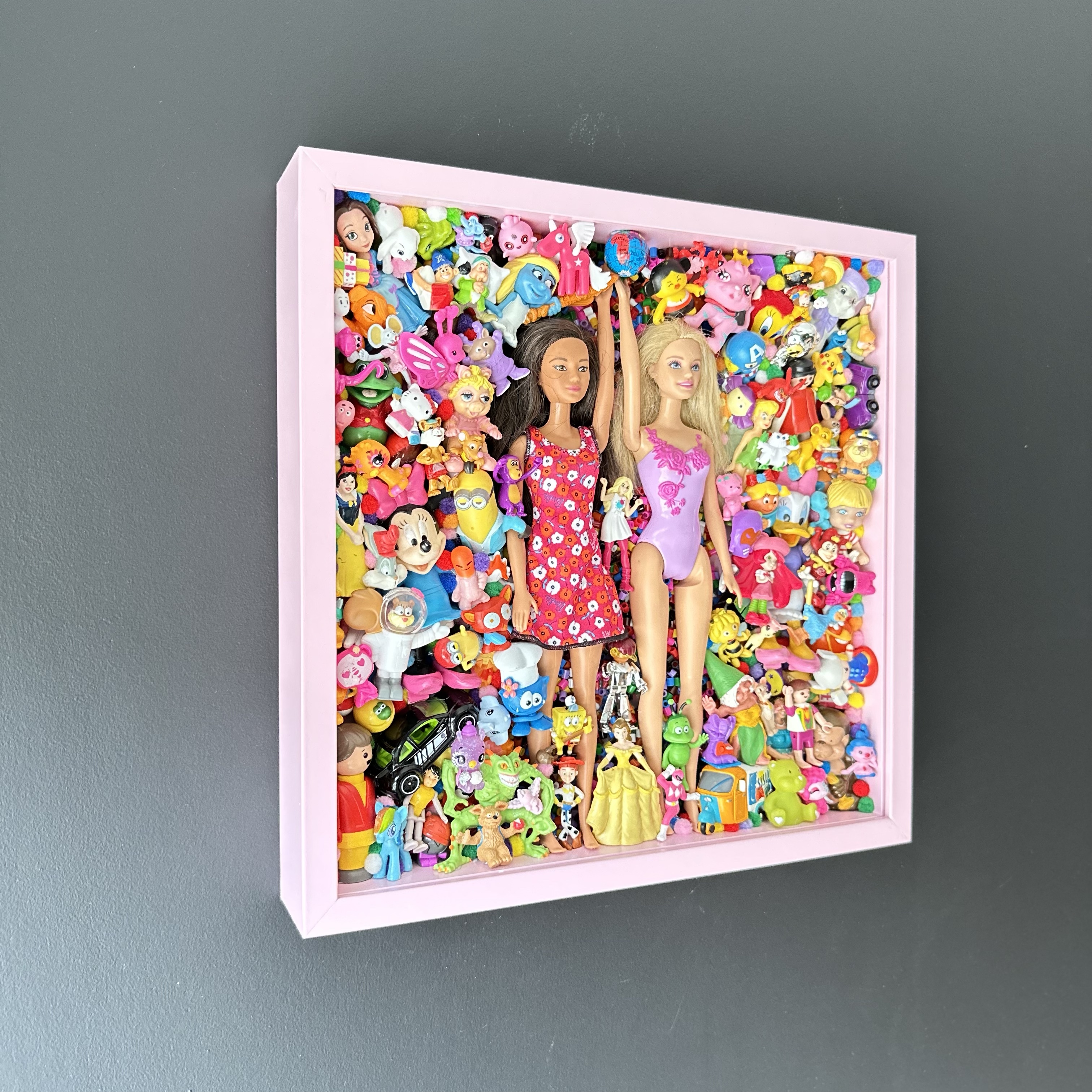 framed abstract collection of glued second-hand toys. frame can be used with or without plexiglass.